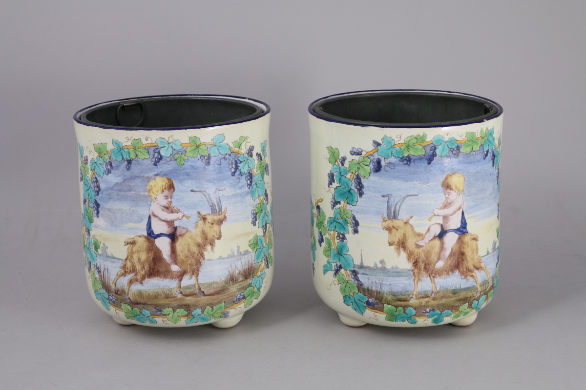 Auguste JEAN (1830-1890), Paire de RAFRAICHISSOIRS à bouteilles, à décor polychrome de putto musicien chevauchant un bouc, de pampres de vignes, et de têtes de bouc. Signés "Jean" au dessous de la pièce.