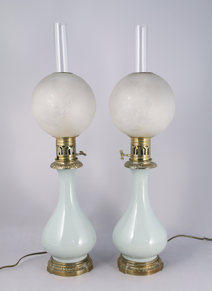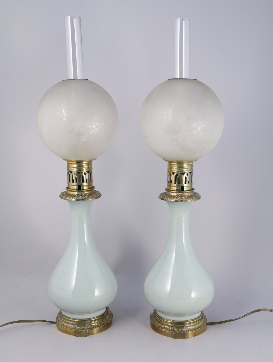 PAIRE DE LAMPES À PÉTROLE en faïence céladon, laiton doré et verre. Le corps est en forme de vase chinois en faïence vert céladon, monté sur un socle en laiton doré et couronné par un système d'allumage à décor de godrons et d'acanthe. Le tout est surmonté d'un globe en verre sablé à décor rocaille feuillagé, tenu par une cheminée de verre.
