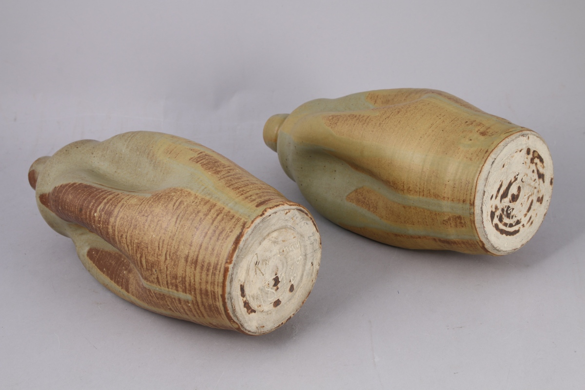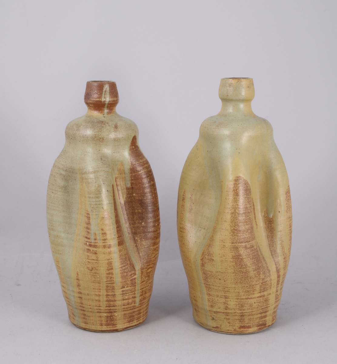 REVERNAY. Paire de BOUTEILLES à côtes pincées en grès flammé émaillé ocre à décor de coulures.