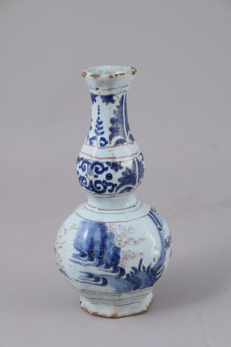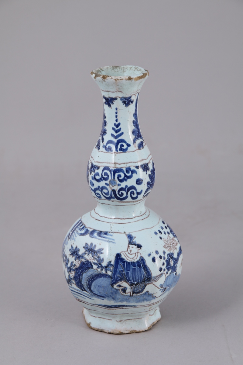 NEVERS. Petit VASE à double renflement en faïence à décor bleu et manganèse de Chinois dans des paysages lacustres.