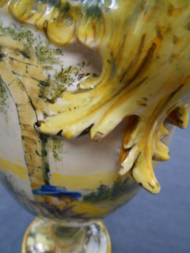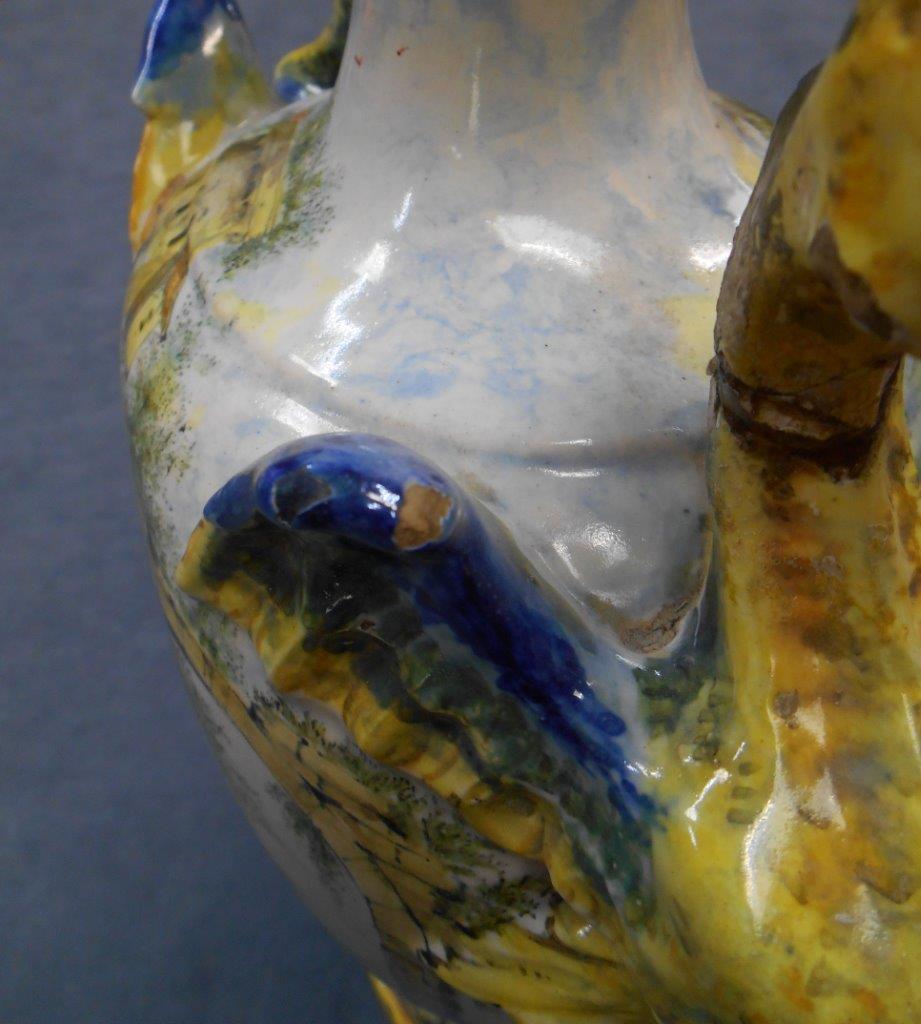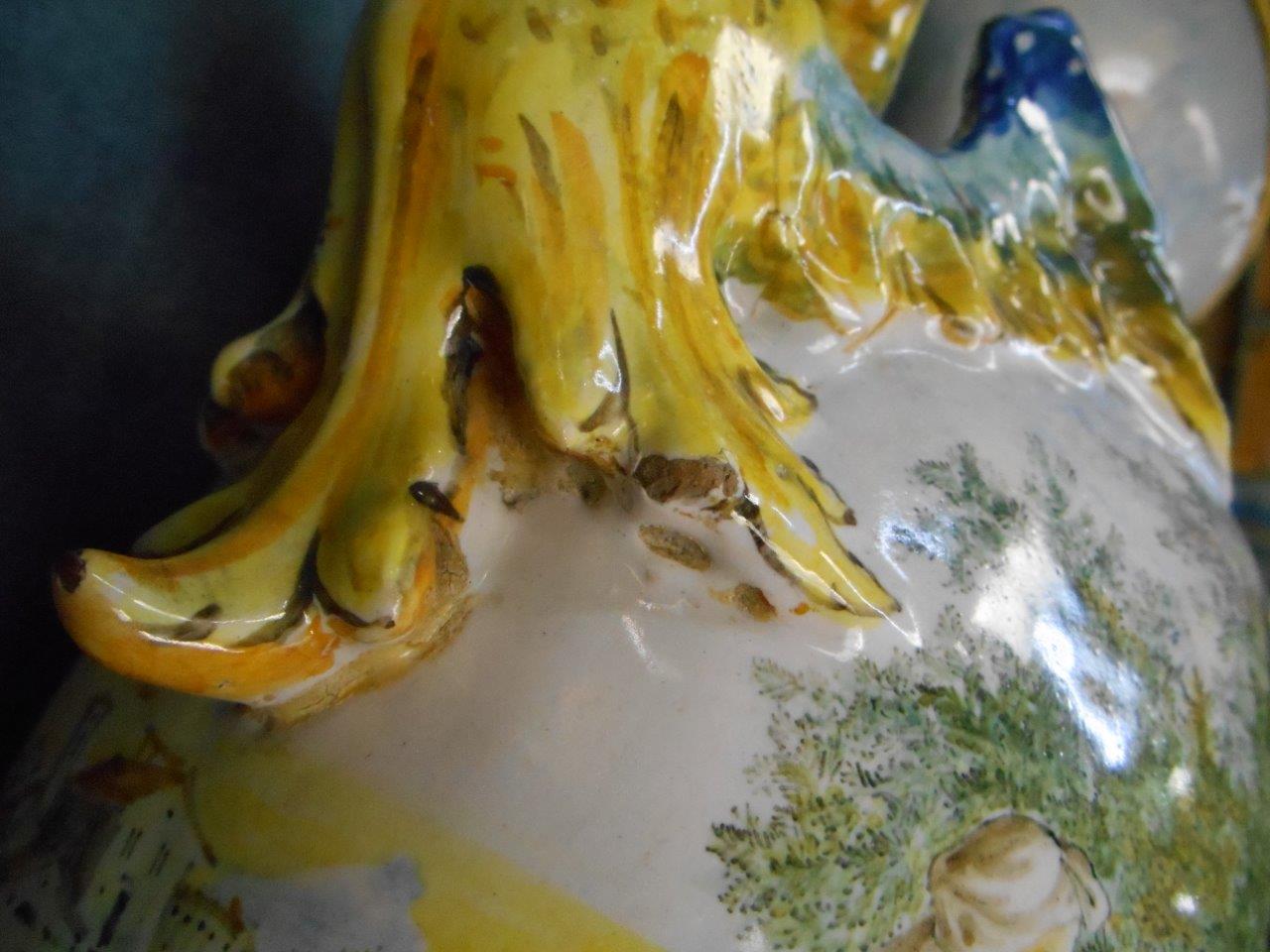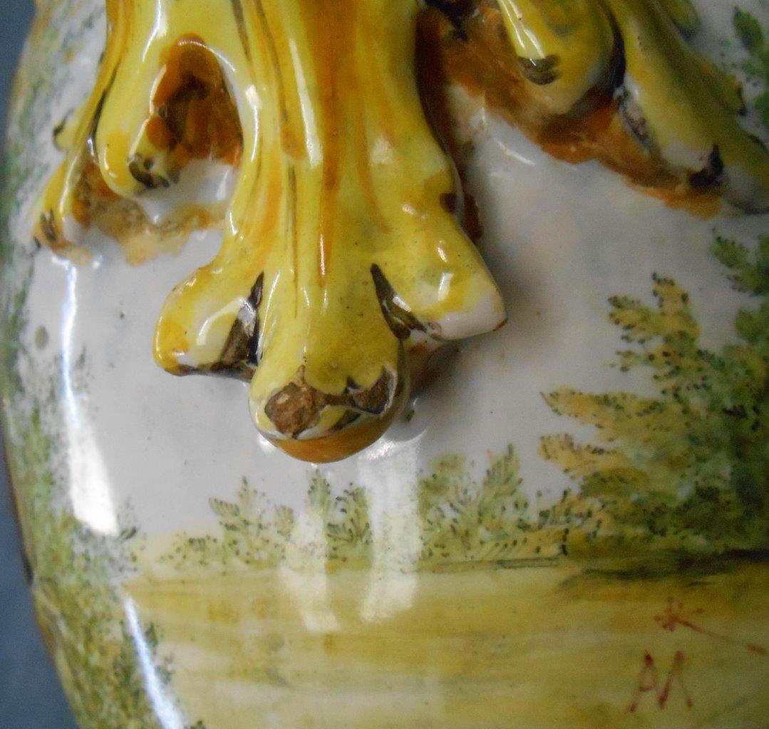 PAIRE de VASES sur piédouche en faïence polychrome, paire de chimères sur les côtés. Scènes rustiques de pêche et de tonte de moutons.