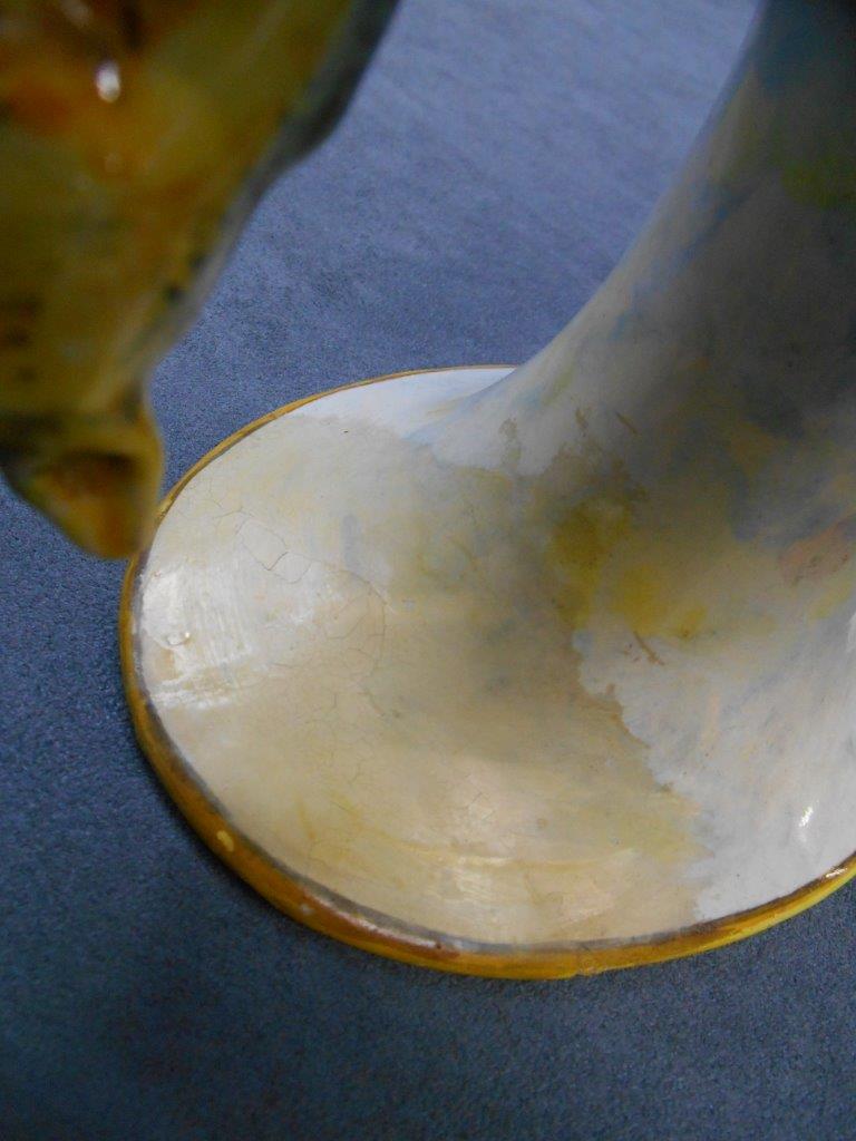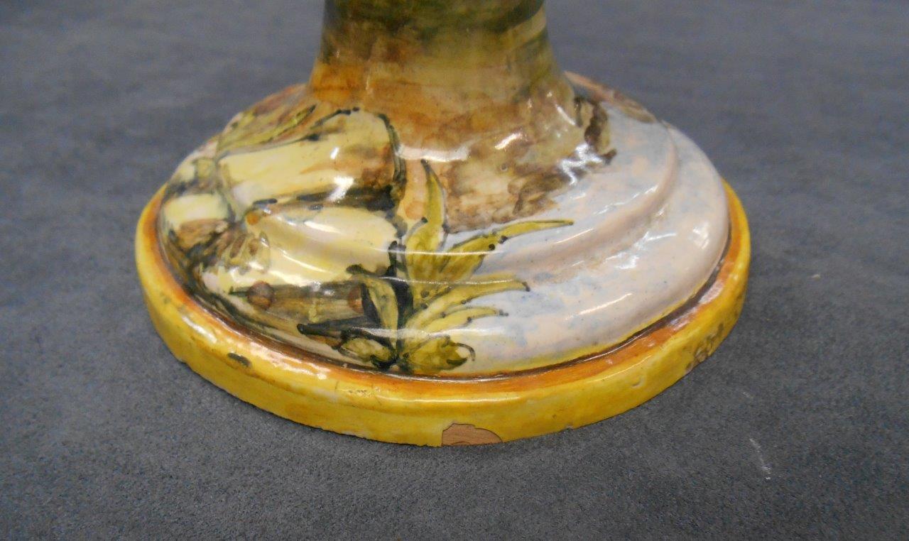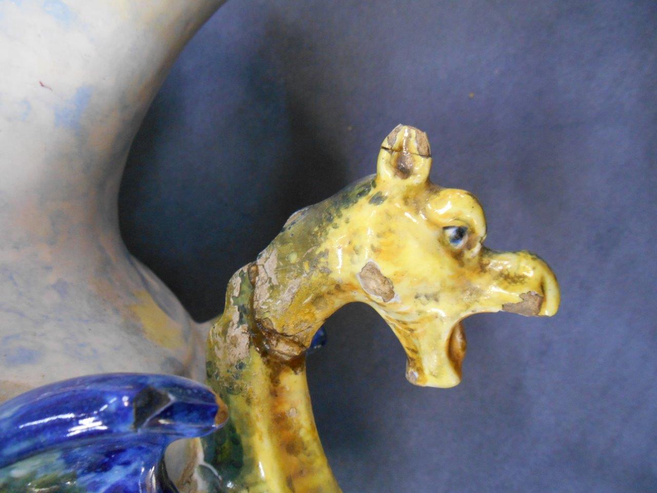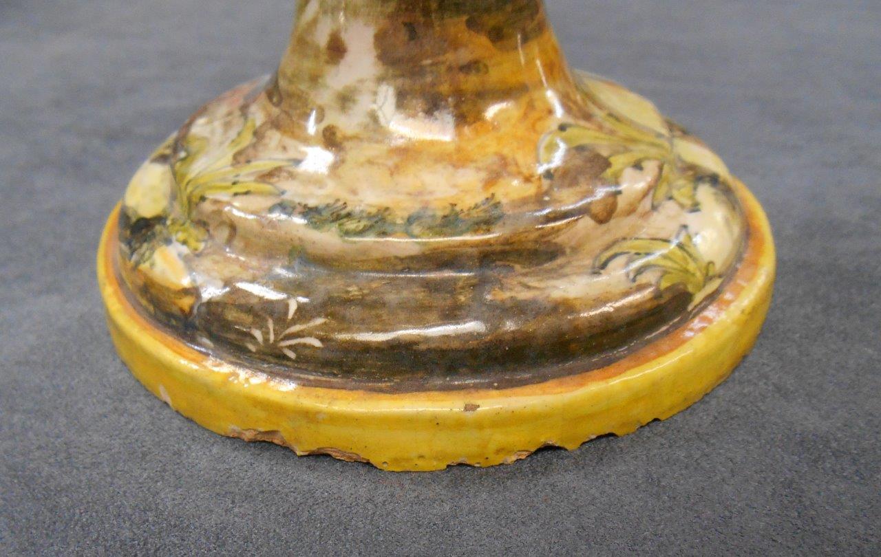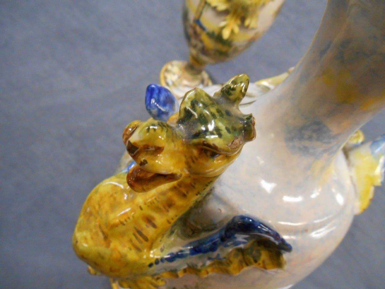 PAIRE de VASES sur piédouche en faïence polychrome, paire de chimères sur les côtés. Scènes rustiques de pêche et de tonte de moutons.