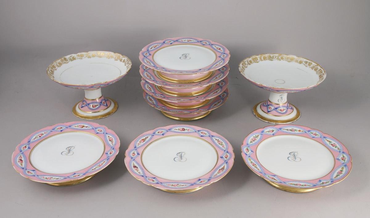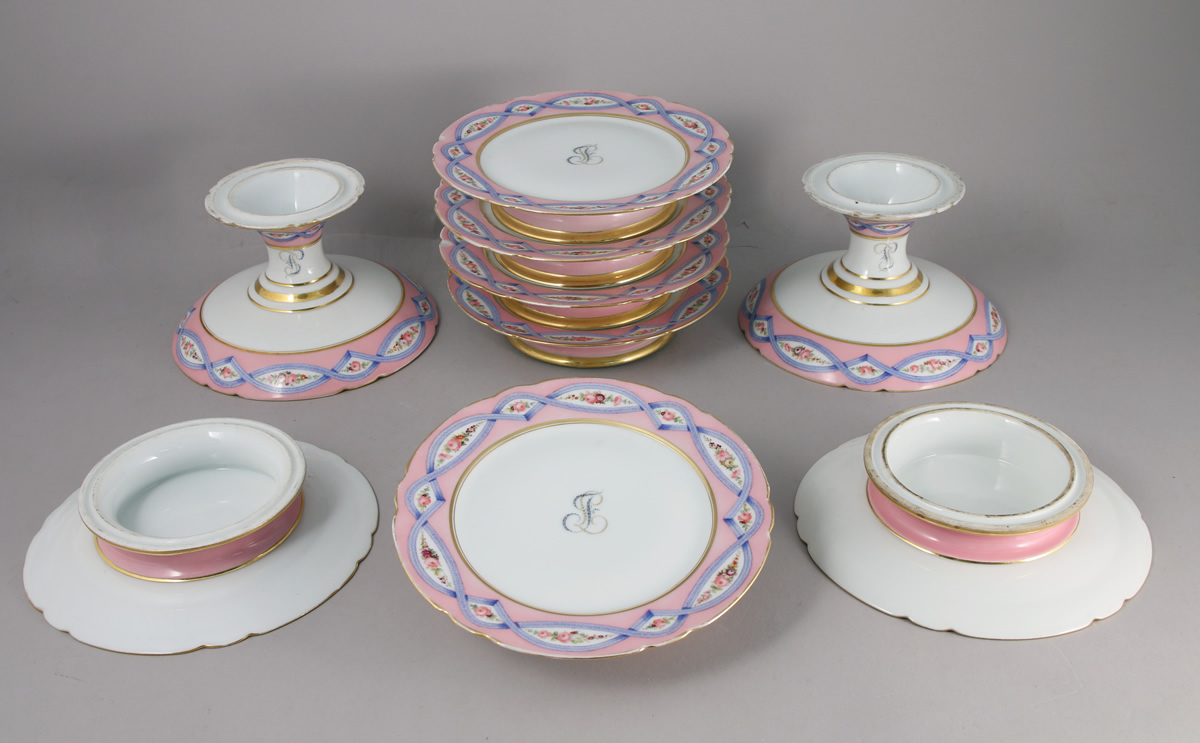 SERVICE À DESSERT, NEUF PIÈCES en porcelaine, décor de roses enrubannées de bleu sur fond rose sur le marlis et le pied agrémenté de filets et de rinceaux feuillagés or dans les plats. Chaque pièce monogrammée "LF". Il se compose de DEUX COUPES et de SEPT ASSIETTES MONTÉES.