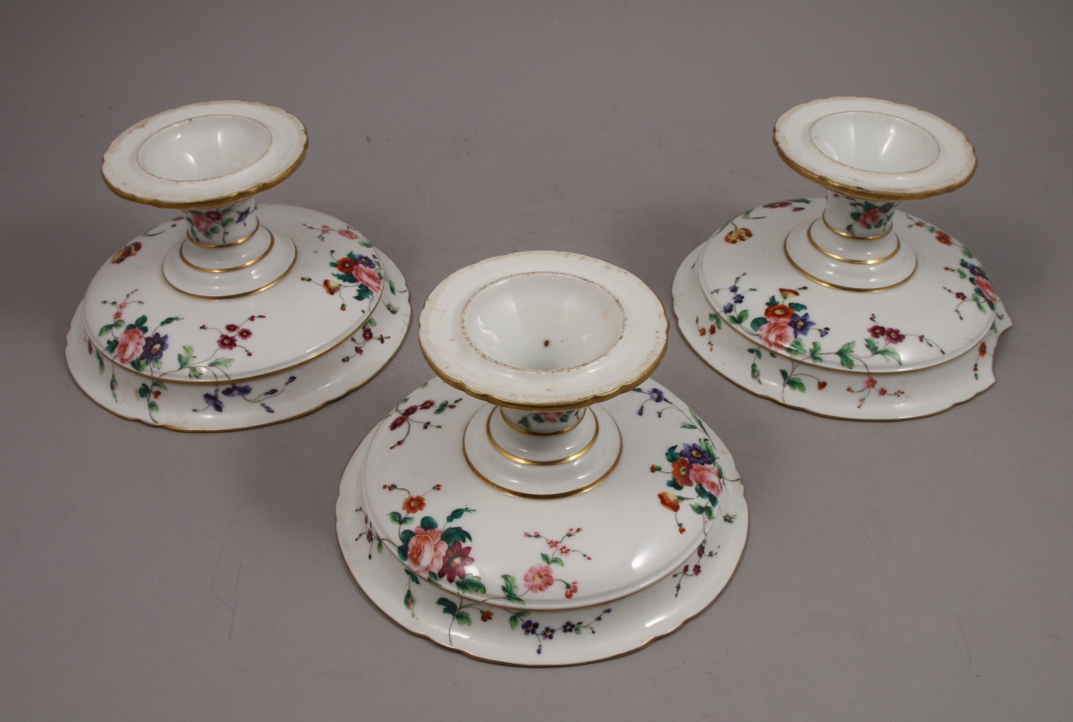 PARIS. TROIS COUPES ronde sur piedouche, en porcelaine polychrome et or. Décor plein de semis de fleurs au naturel et tulipes.