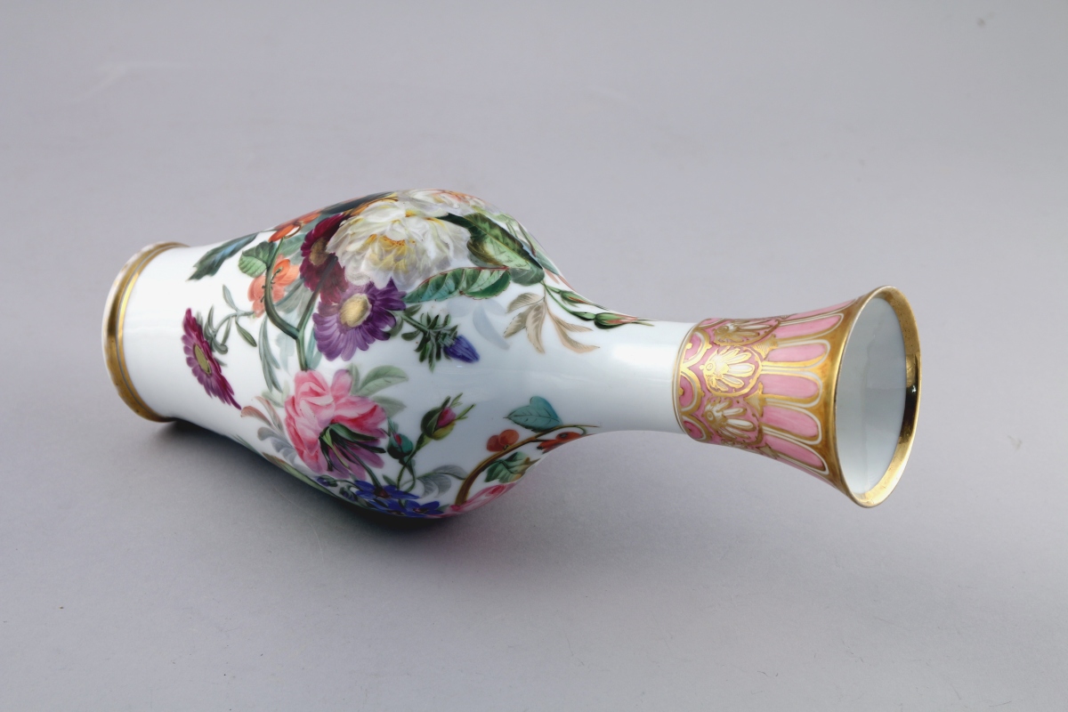 PARIS. VASE en PORCELAINE de forme balustre à décor floral de roses, ipomées, bourraches et de cynorrhondons sur la panse. Le col orné d'une frise de godrons et de palmettes aux rehauts d'or sur fond rose.