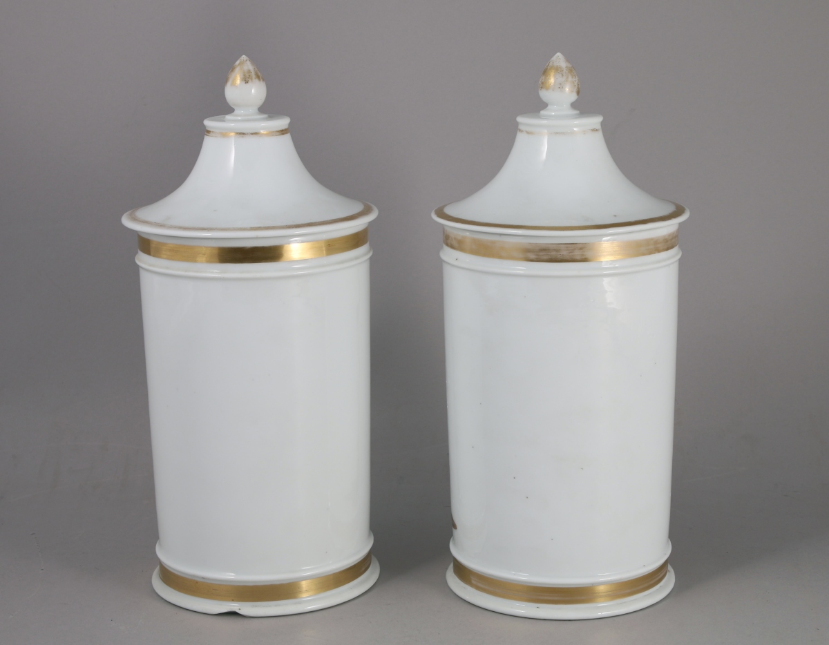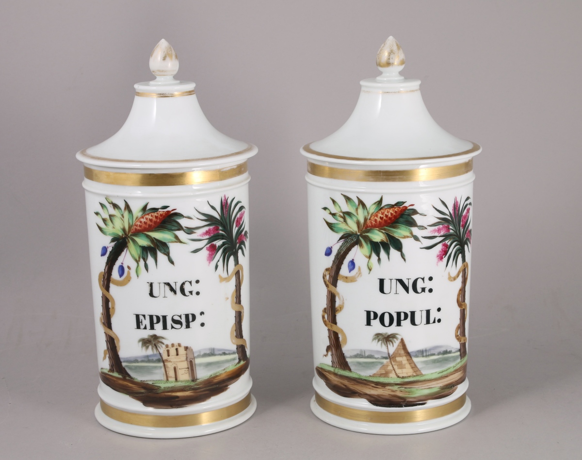 PARIS. PAIRE de POTS À PHARMACIE en porcelaine, à couvercle surmonté d'une prise en forme de goutte, à décor de sur lesquels viennent s'enrouler des serpents dorés. Paysage de palmier à la pyramide et au mastaba en arrière plan. Liserets dorés courant sur le pourtour. Inscriptions "UNG: EPISP" et "UNG: POPUL:" sur le devant, pour unguens epispaticum (onguent épispatique) et unguens populéum (onguent aux bourgeons de peuplier).