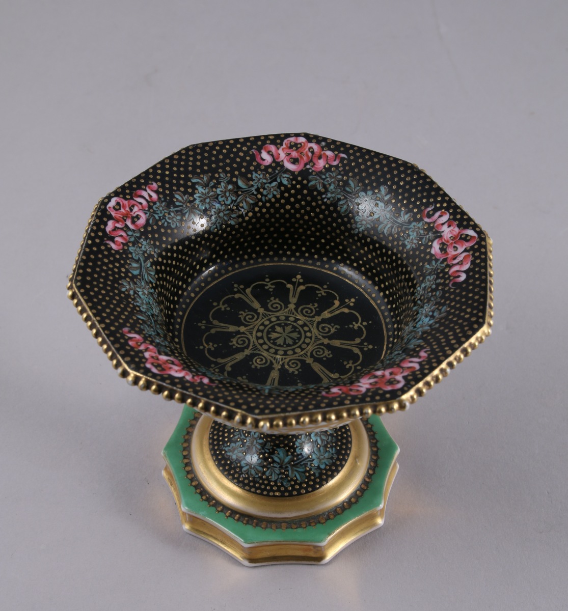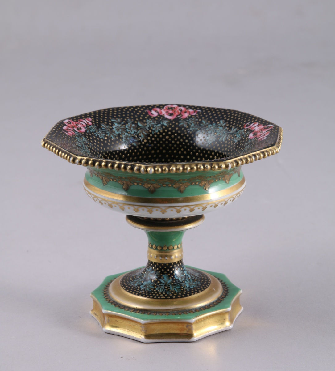 MONGINOT. Petite COUPE sur piédouche de forme décagonale en porcelaine émaillée polychrome. L'intérieur présente un décor de guirlandes feuillagées retenues par des rubans noués sur fond noir semé de pois or en relief. Le bassin orné d'un fleuron. Le bord agrémenté d'un rais de perles. L'extérieur en partie émaillé vert reçoit des frise feuillagées. Signée "Monginot".