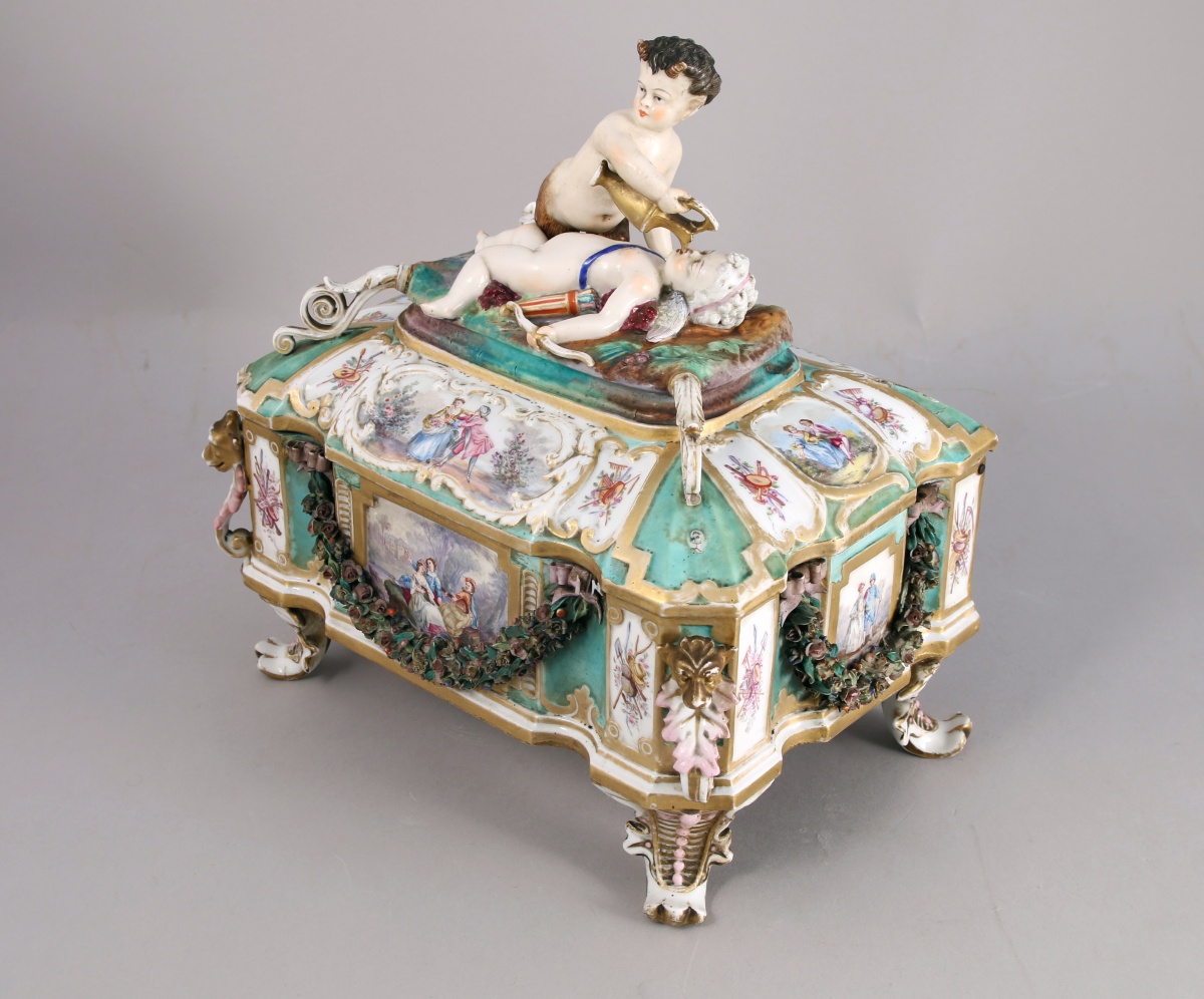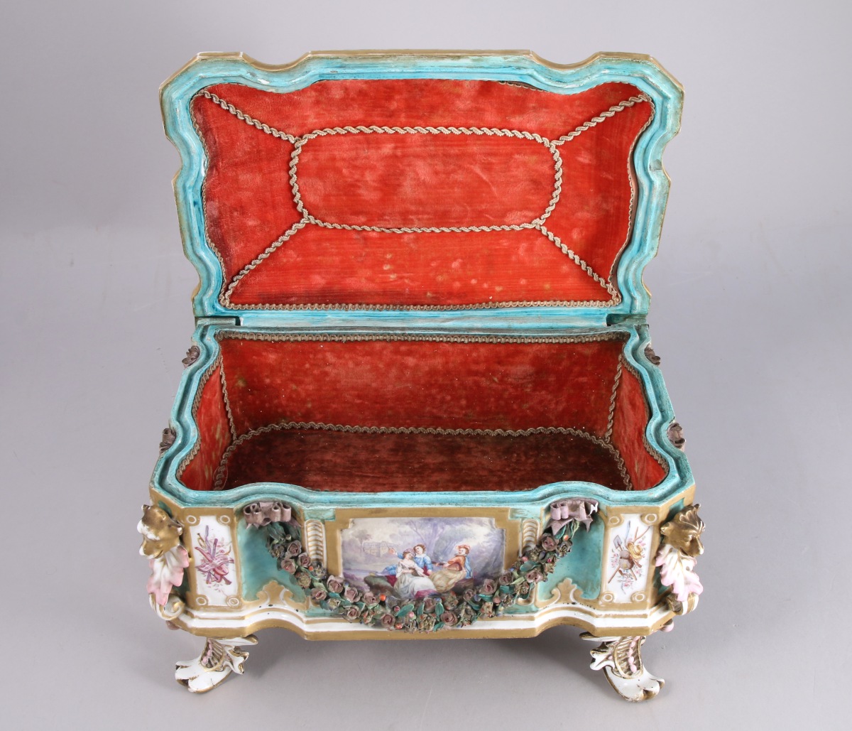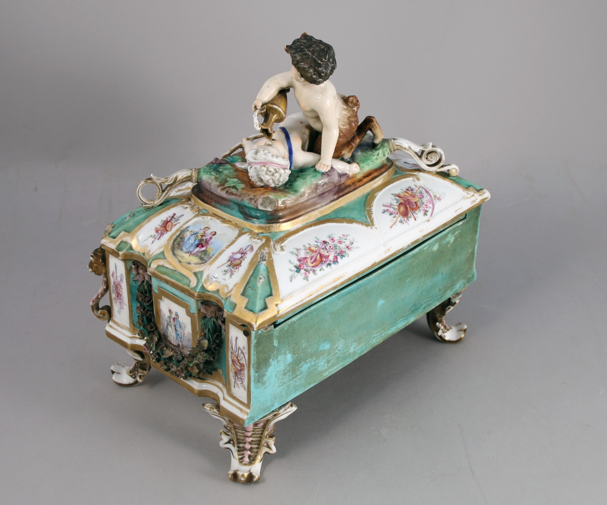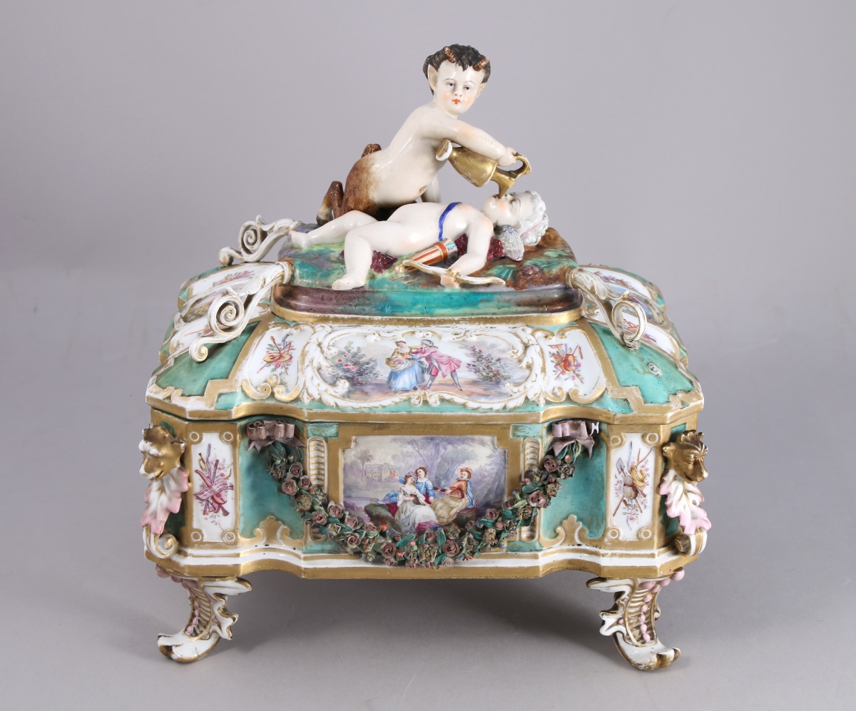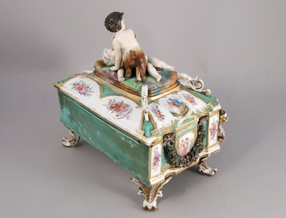 Attribué à la maison SAMSON. COFFRET à BIJOUX du SATYRE ENIVRANT L'AMOUR en porcelaine polychrome et doré. De forme rectangulaire à pans coupés le coffret repose sur quatre pieds mouvementés ; il est décorée de scènes amoureuses peintes dans des cartouches entourés de guirlandes fleuries en appliques. Le couvercle, articulé par une charnière, est surmonté d'un groupe en biscuit figurant un petit satyre dyonisiaque ennivrant un amour ailé assoupi. Marques aux sabres surmontant une étoile.