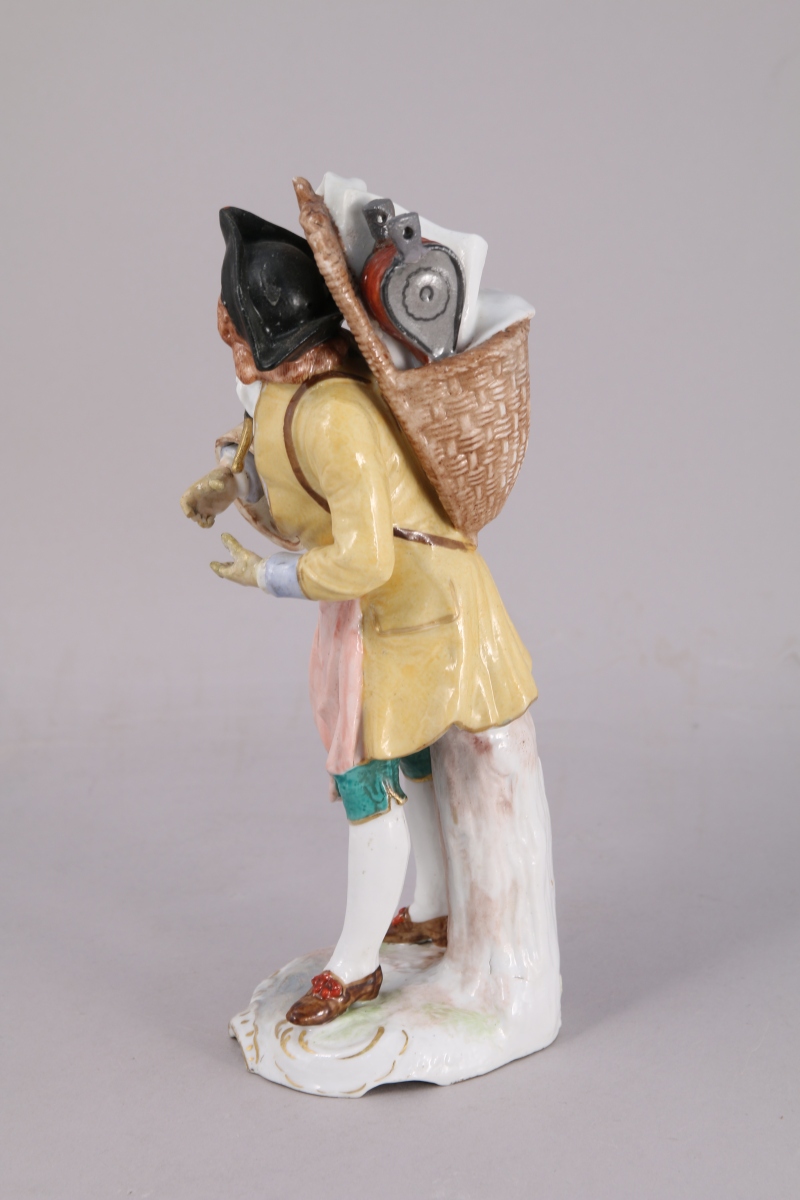 SAMSON, dans le goût de Meissen. SUJET en PORCELAINE, vendeur ambulant de soufflet, en habit de gentilhomme et coiffé d'un tricorne, un panier rempli de soufflets sur le dos. Socle à ornements rocailles. Rehauts d'or. Marque aux épées dans la glaçure sous la pièce.