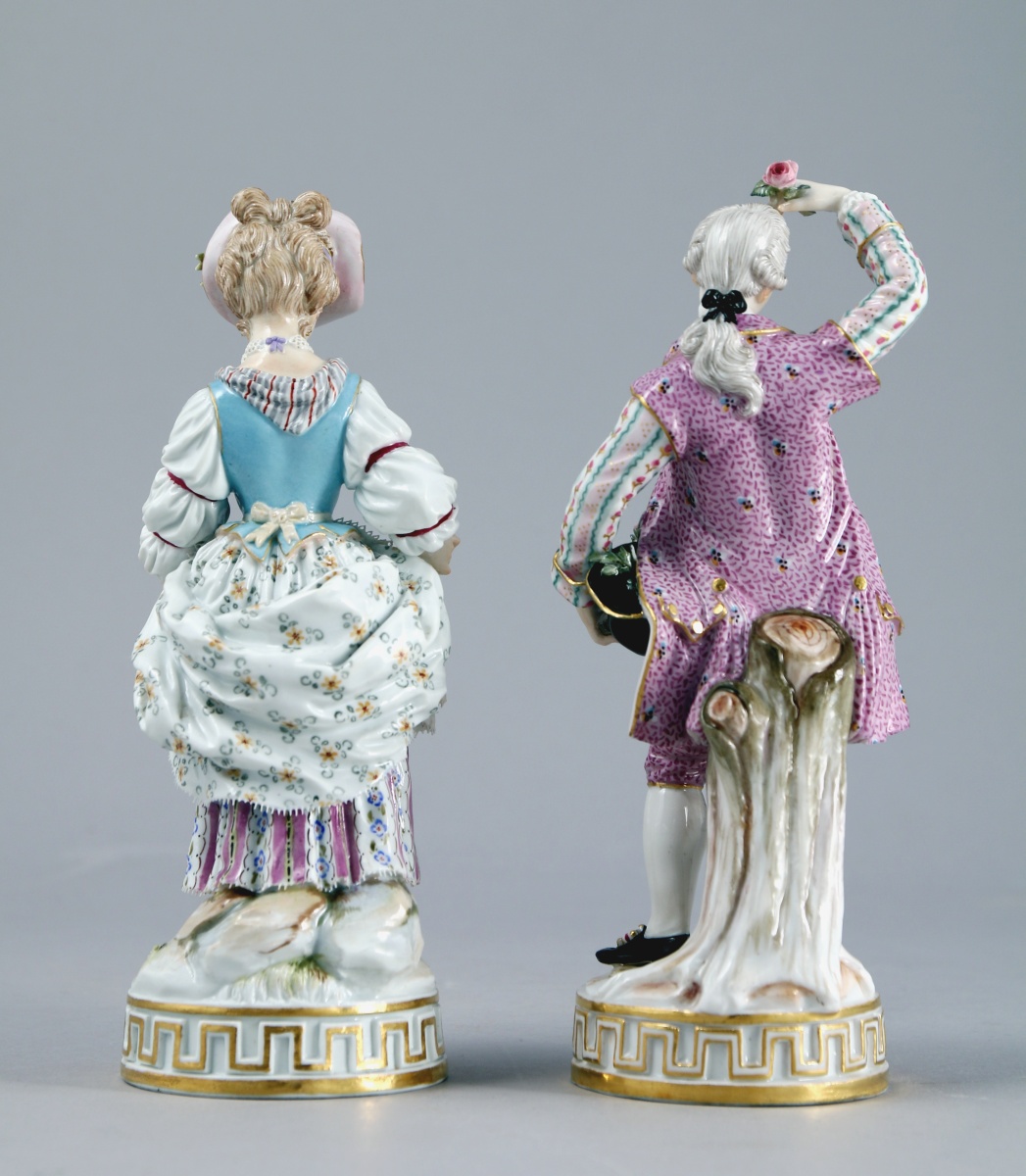 MEISSEN. Paire de sujets en PORCELAINE polychrome figurant une vendangeuse et un gentilhomme galant. Ce dernier adossé à un tronc s'apprête à tendre une rose cueillie dans un bouquet qu'il a disposé dans son chapeau. La jeune femme tient dans son tablier des grappes de raisin blanc et noir et baisse la tête avec timidité.