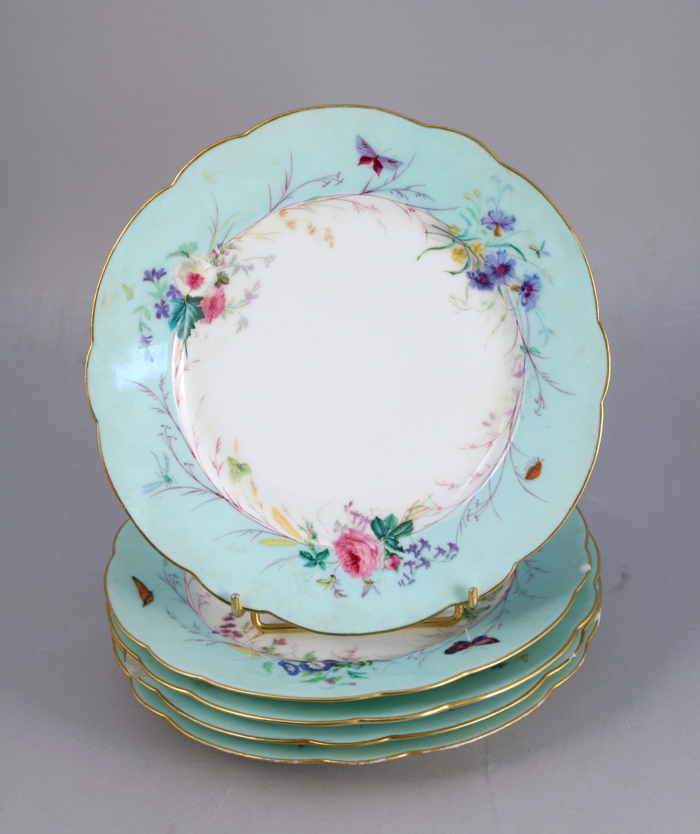 JOINT: suite de CINQ ASSIETTES À DESSERT de forme ronde à bords chantournés à décor en décalcomanie de bouquets floraux et insectes. Aile vert d'eau à filet or. XXe.