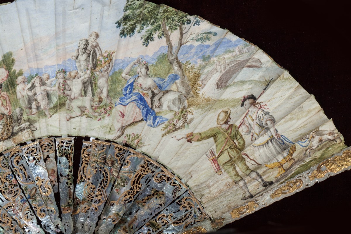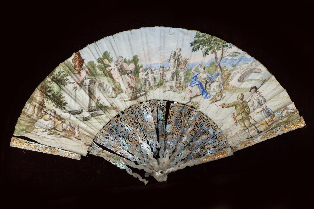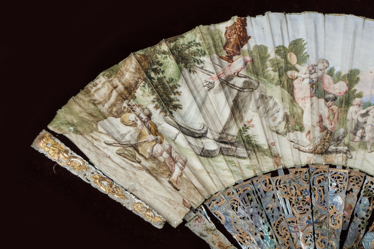 ÉVENTAIL de type plié. Feuille en peau peinte à la gouache. Monture en nacre blanche, repercée, sculptée, gravée et rehaussée à la gouache, à décor de personnages et instruments de musique. Les panaches gravés et appliqués d'un décor en or.