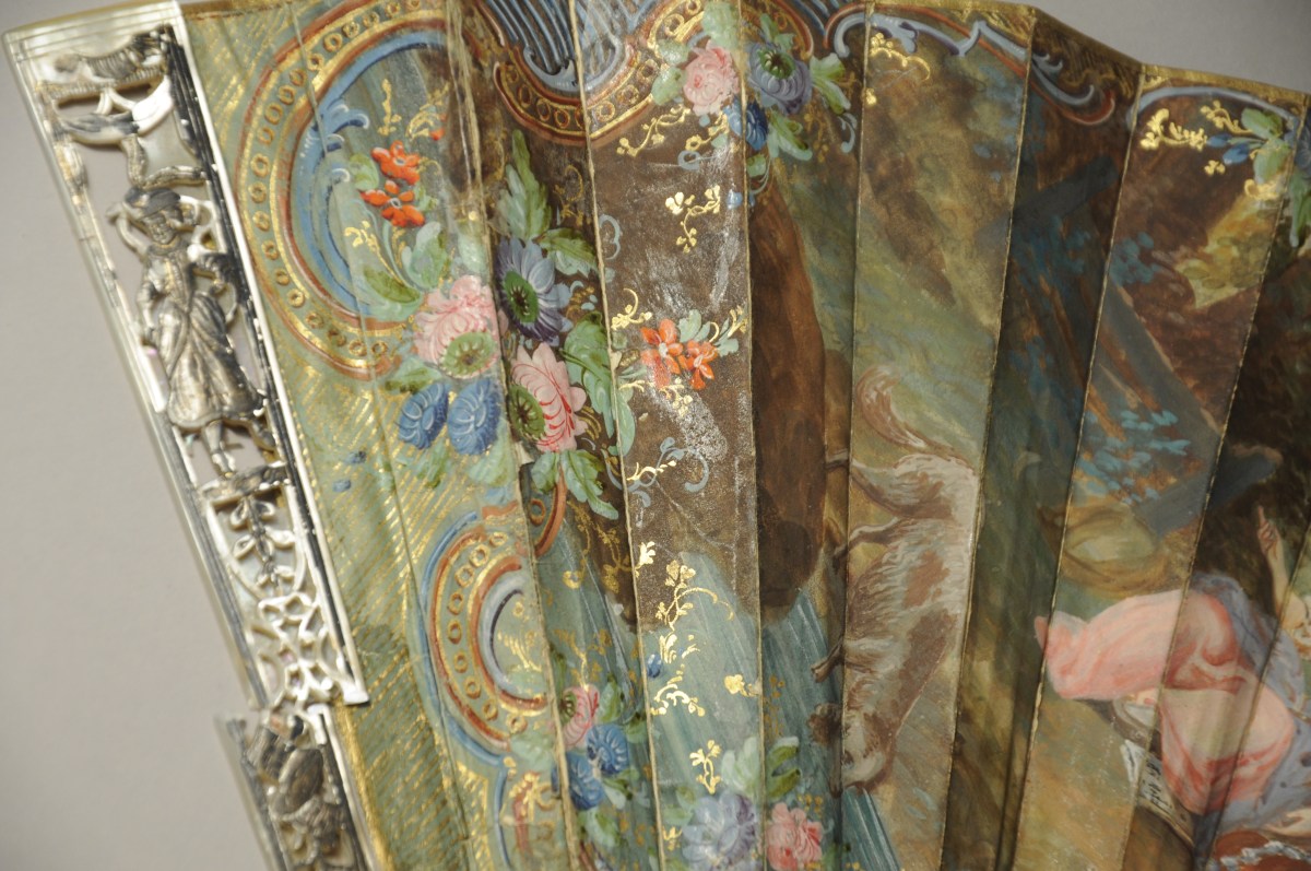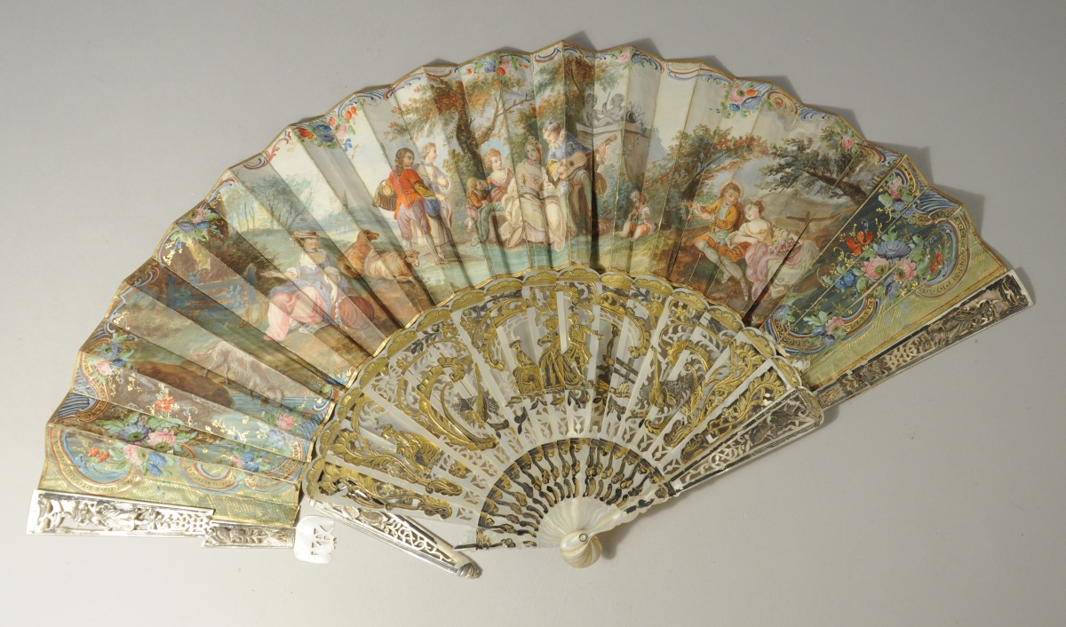 ÉVENTAIL plié. La feuille en papier marouflé sur parchemin peint à la gouache de scènes galantes près d'une rivière dans un entourage de fleurs et de rinceaux. Monture en nacre ajourée de personnages et rinceaux fleuris rehaussés or et argent.
