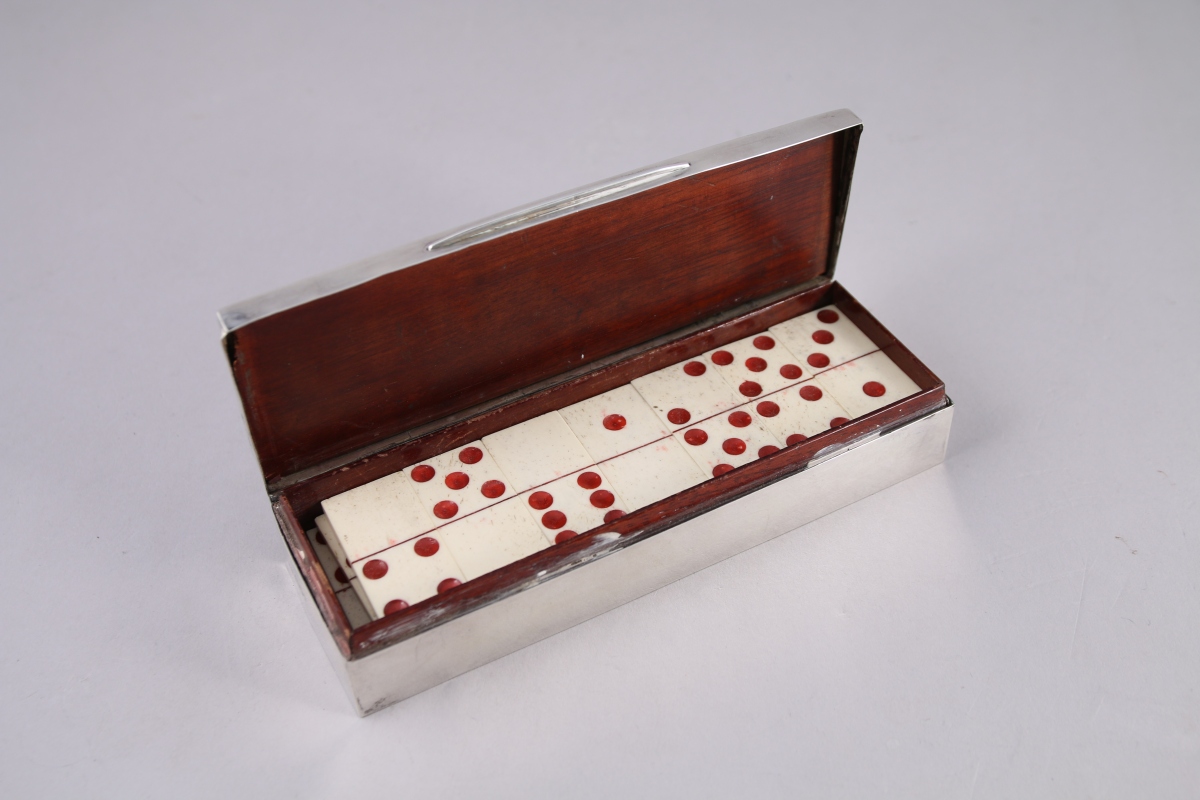 JEU de DOMINO dans une boite en argent à l'intérieur en bois exotique.