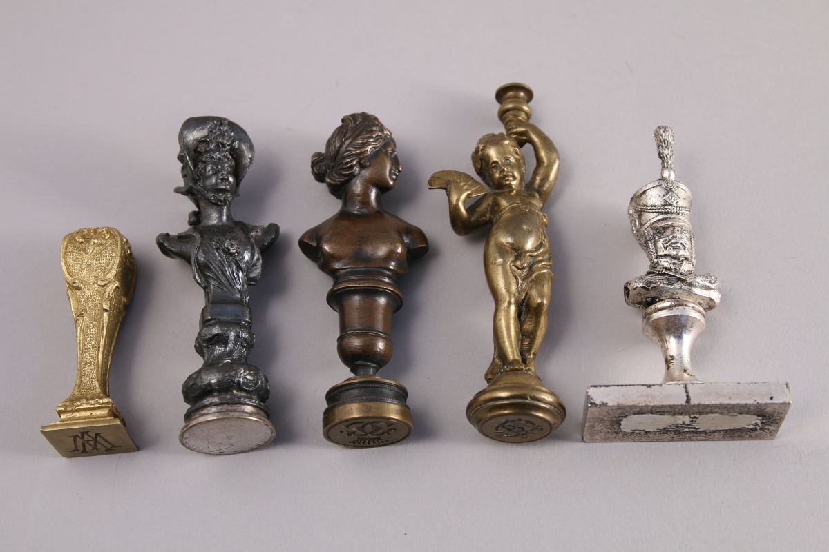 - Cachet figurant un buste de déesse antique en bronze patiné. Matrice monogrammée "CC" timbré d'une couronne comtale. Haut. 9,5 cm.