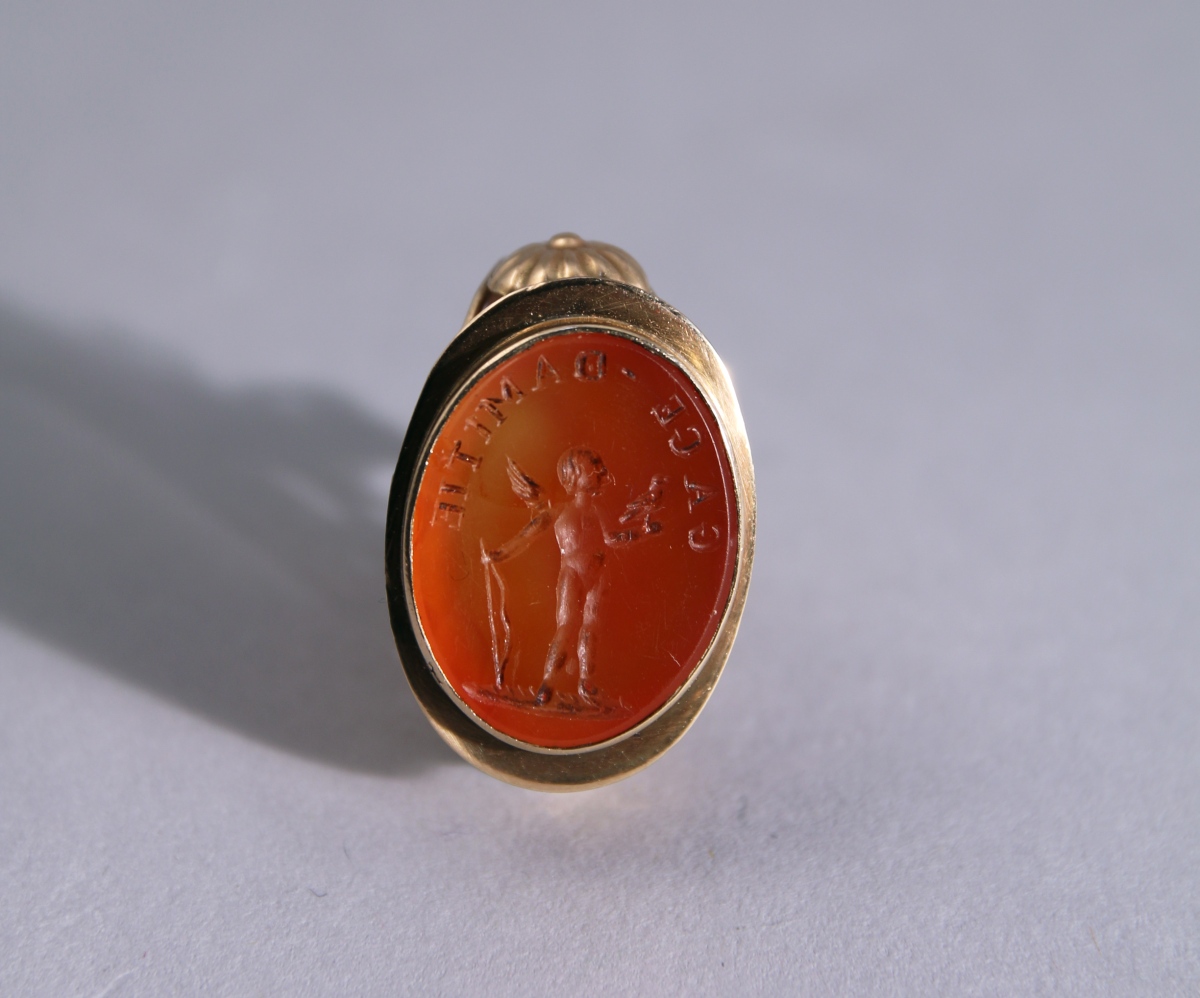 SCEAU à CACHETER en or jaune à décor ajouré d'entrelacs, perles et fleurons. Matrice en cornaline gravée en intaille de Cupidon tenant une colombe de la main droite et un arc de la main gauche. Légende: "Gage d'Amitié".