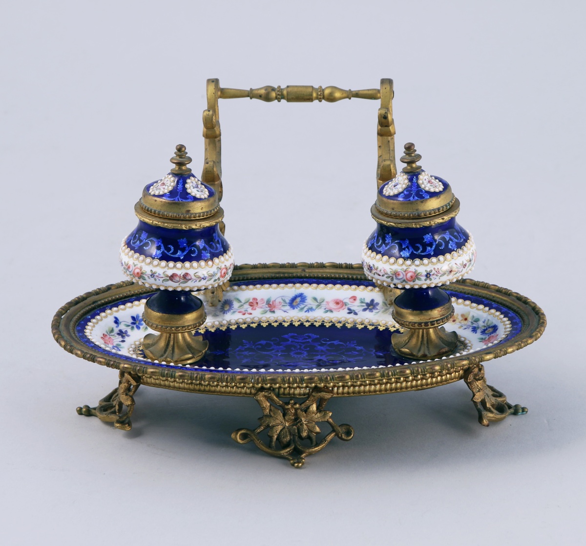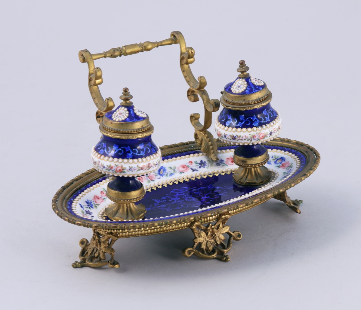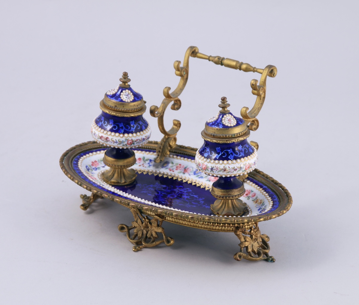 Ses deux godets à encre au couvercle retenu par une charnière sont en forme de coupe balustre et reposent sur un plateau ovoïde soutenus par quatre pieds en bronze doré à décor d'entrelacs et de feuilles de chêne. Le plateau est muni d'une poignée de transport en forme d'enroulements en C à feuilles d'acanthe. Le décor à l'émail présente un fond bleu à arabesques en filigrane, à filet de paillons dor figurant des rinceaux et des festons abritant de petites perles démail. Un décor floral polychrome à fond blanc cerne le plateau et les godets dont les couvercles sont ornés de trois médaillons avec même décor. Cerclage de bronze doré à rang d'oves et de balustres.