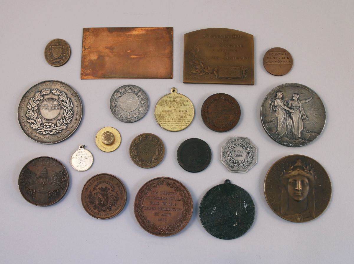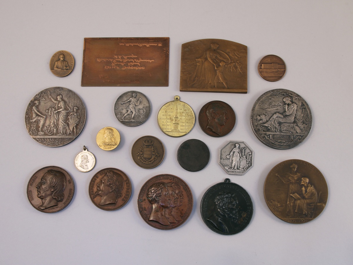 RÉUNION de 17 MÉDAILLES dont: Michel-ange, "M ANGELVS . BONAROTVS PATRITIVS FIORINIINVS" plomb (Diam. 5,5 cm); Société Générale de Crédit Industriel et commercial / 7 mai 1859, jeton octogonal, argent (Diam. 3,8 cm, poids: 20 g.); "Aux députés du dépt de la Vendée élus en 1818 leurs commettants et amis 1820 (Diam. 6 cm), cuivre; Louis Marie de Cormenin, cuivre (Diam. 5 cm)...