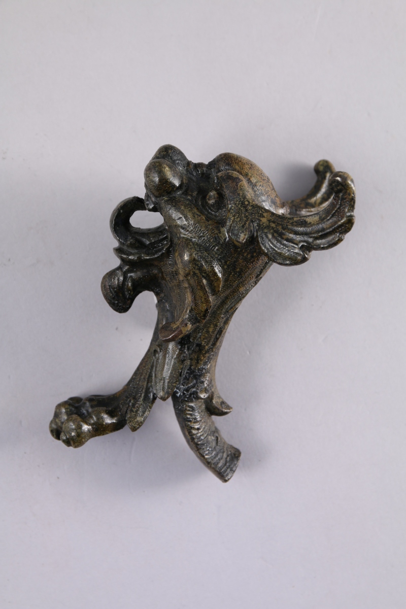 ÉLÉMENT en bronze ciselé et patiné figurant une TÊTE de CHIMÈRE, gueule ouverte, terminée par une griffe. Cet élément faisait probablement partie d'un ensemble de bronzes d'ameublement.