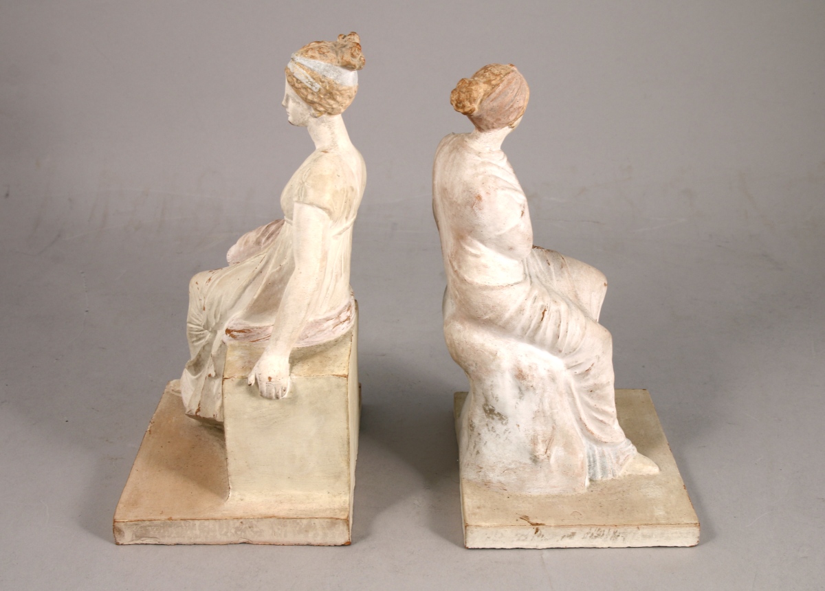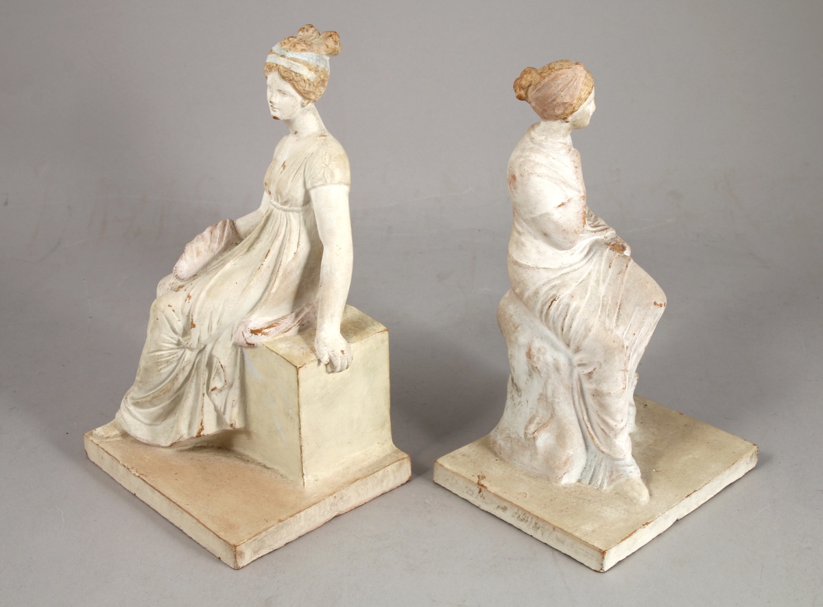 Paire de STATUETTES en terre cuite représentant des femmes péplophores assises. L'une est drapée dans son himation et assise sur un roc brut, l'autre est vetue d'une robe à l'antique ceinte sous la poitrine et assise sur un socle rectangulaire. Traces de polychromie au bleu, rose, or sur la terre cuite et effets de patine. Mention "L.I." en creux sous la base de la femme à la robe.
