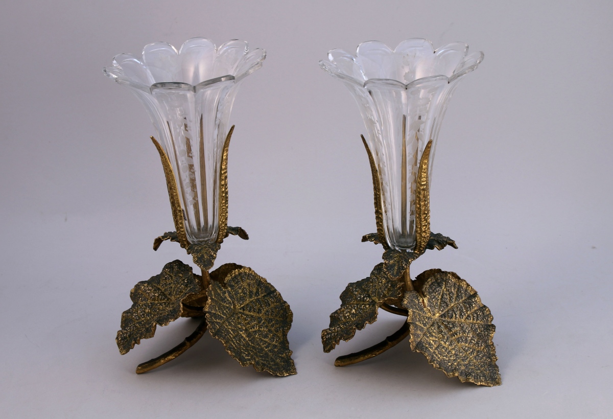 Paire de VASES CORNET à pans coupés en verre à bordures polylobées. Ils sont gravés de motifs de fleurs et de feuilles. Montures en bronze figurant une branche de tilleuil dont deux feuilles servent de piètement.