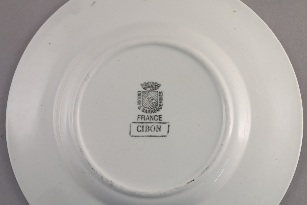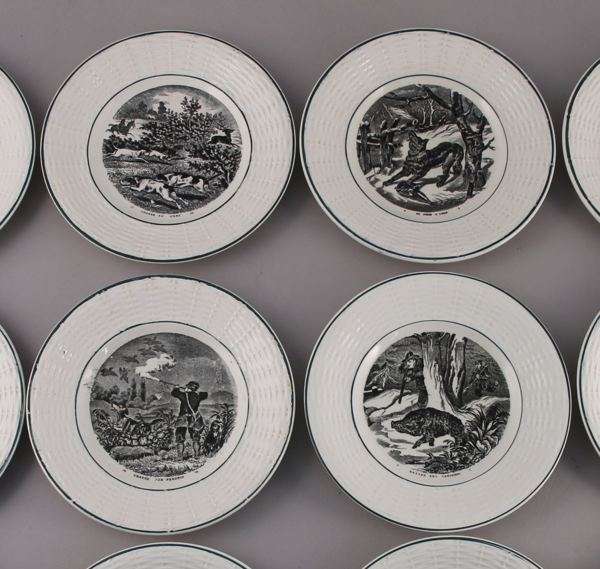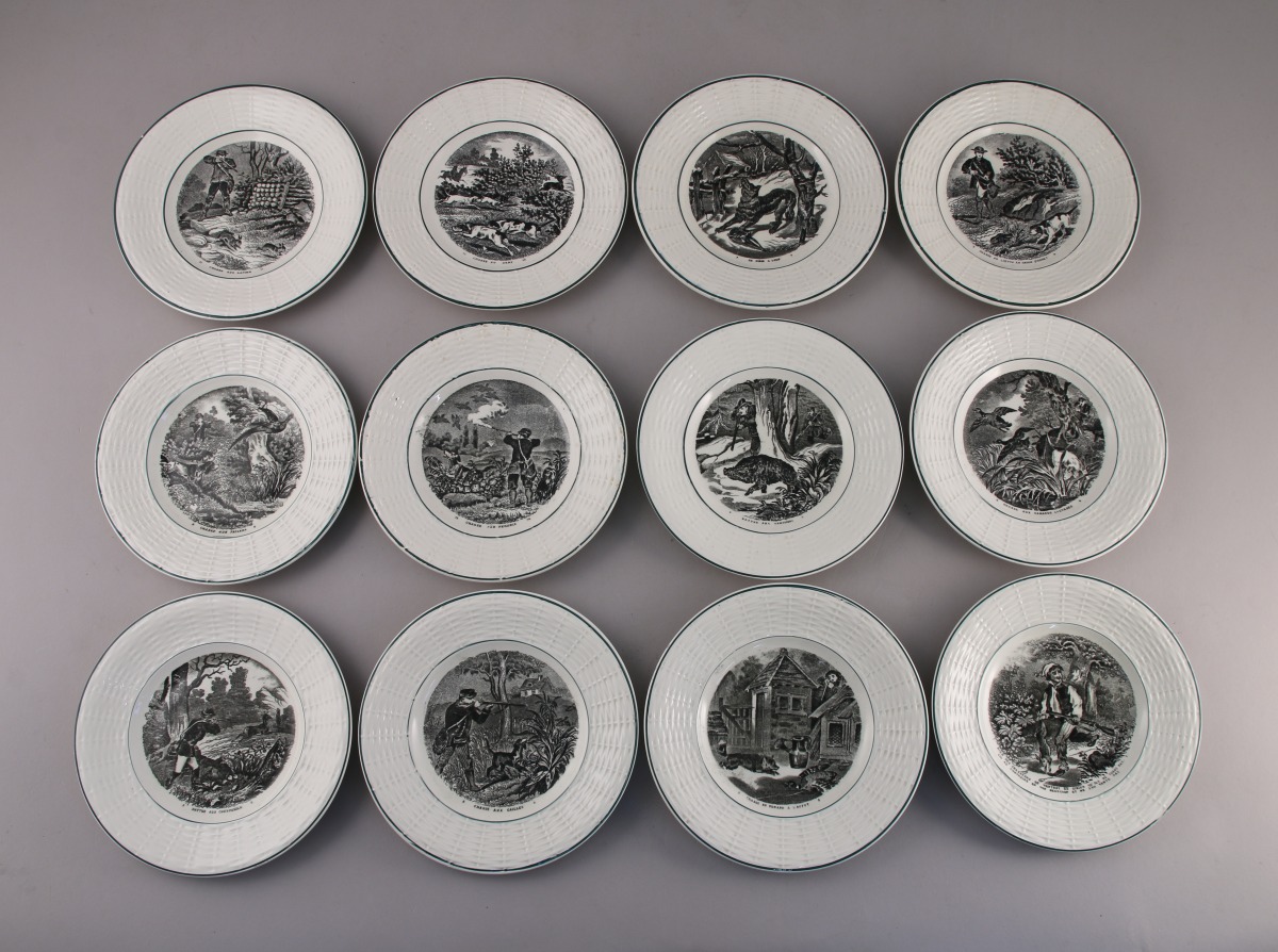 DIGOIN et SARREGUEMINES. 12 ASSIETTES à DESSERT en céramique à décor de scènes de chasse à tir, vignettes noir et blanc.