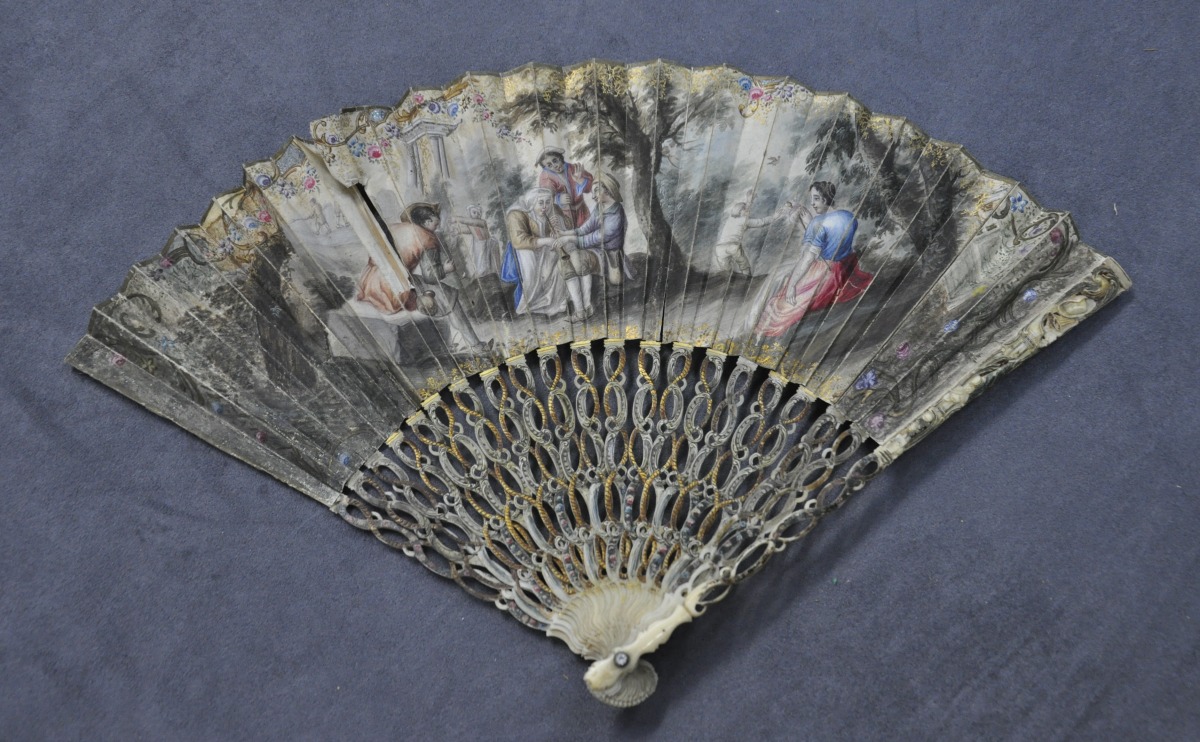 ÉVENTAIL en ivoire (elephantidae SPP) sculpté polychrome, 22 brins, la feuille ornée d'une gouache avec rehauts de mica d'une scène champêtre.