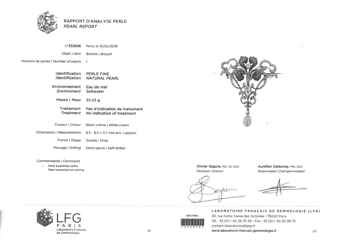 Accompagné d'un rapport d'analyse perle, du L.F.G. n° 332836, daté du 15/02/2018, précisant: