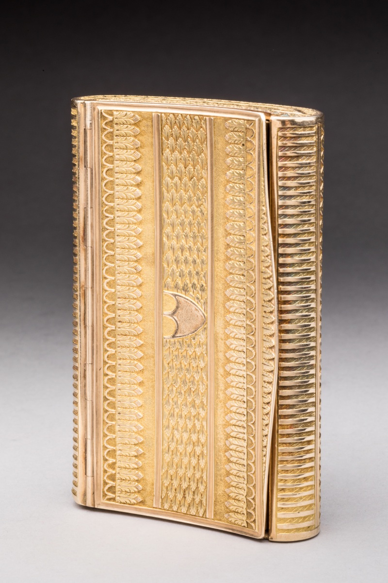 de deux tons, jaune et rose, mat et bruni. Riche décor finement ciselé de frises feuillagées en ruban. Le couvercle à charnière centré d'un écu, le dos d'un ovale.