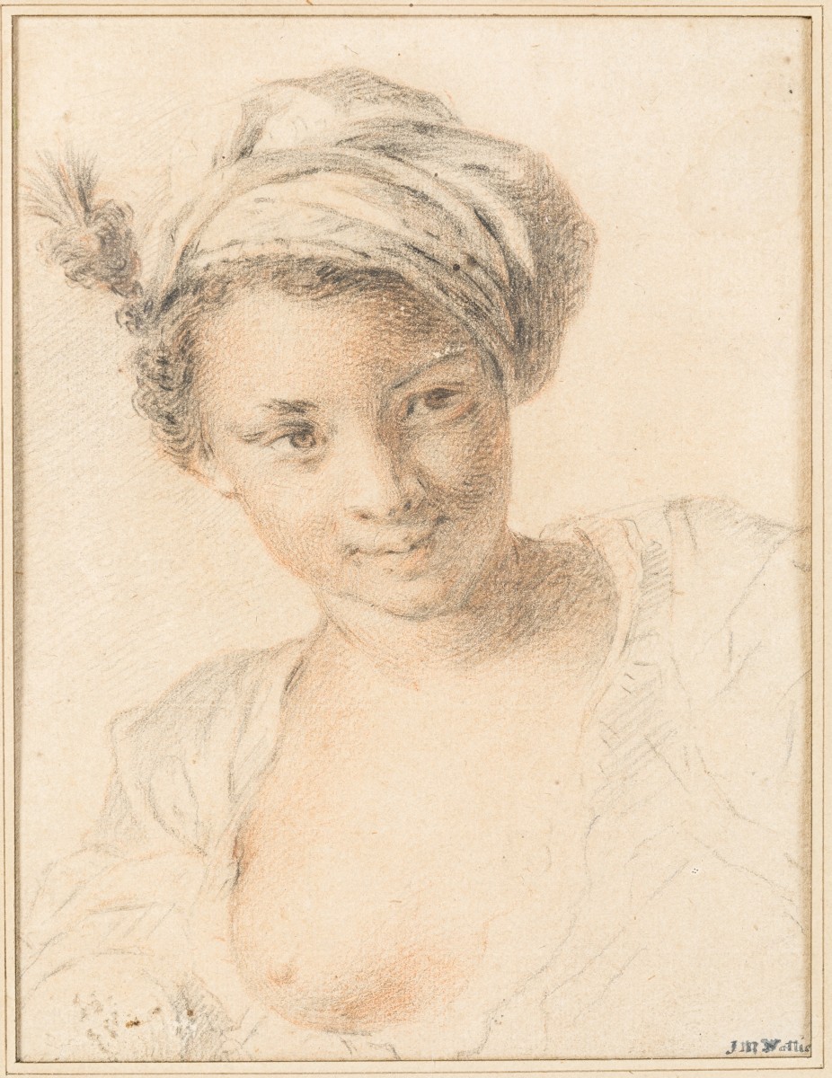 Our drawing is a preparatory study for the servant on the right in the painting 'Mademoiselle de Clermont as a Sultana', Wallace Collection, London.