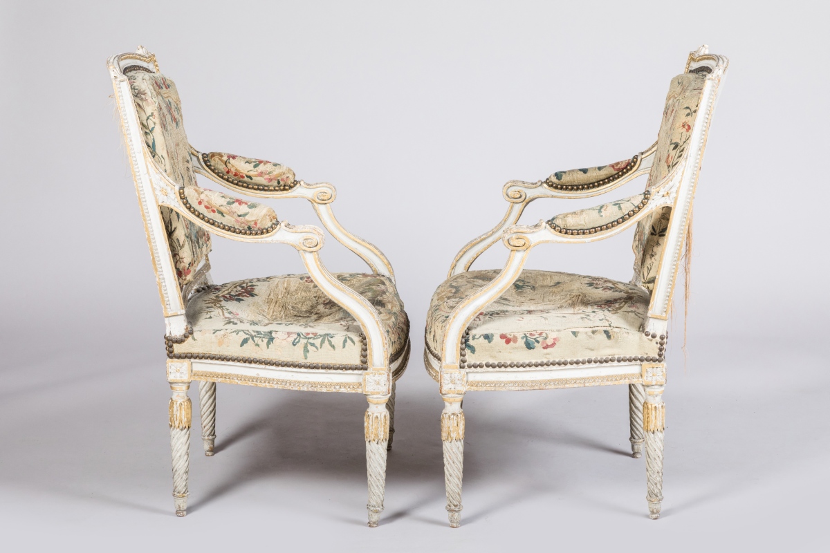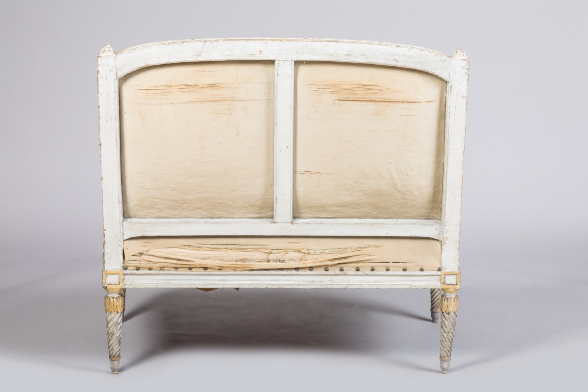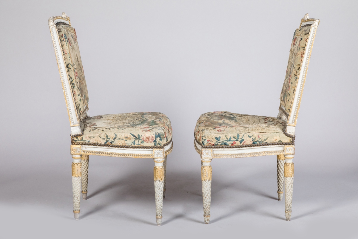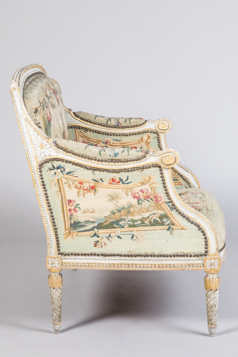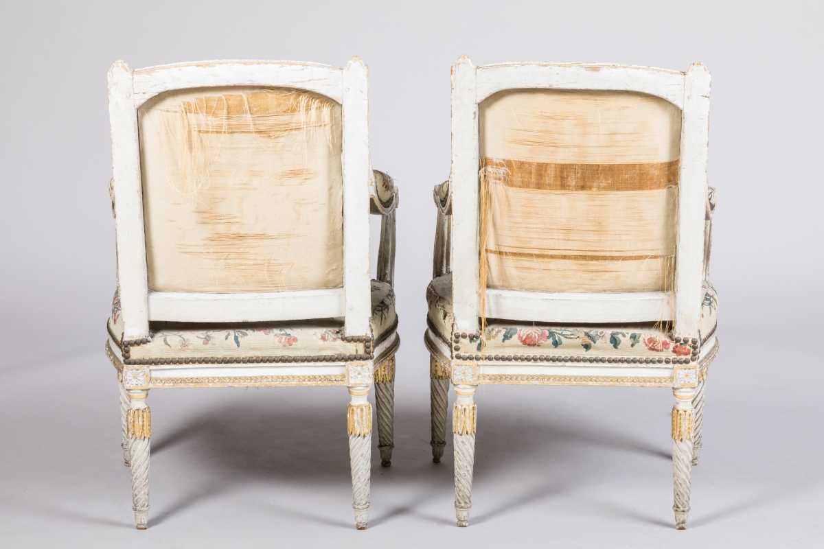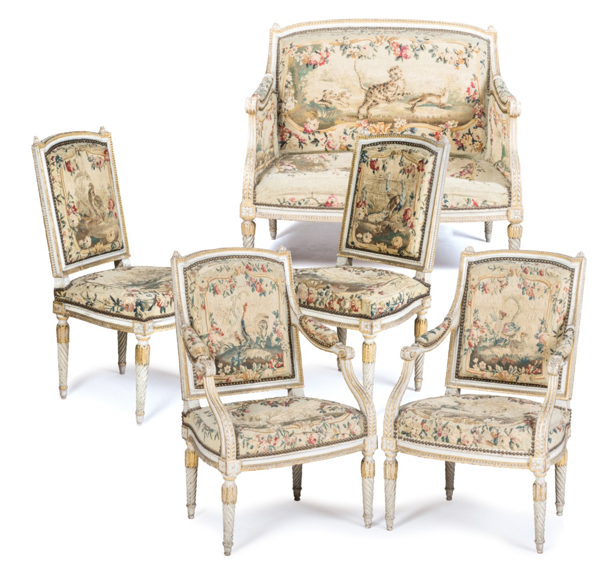 en bois sculpté, laqué gris "Marie-Antoinette". Il se compose d'une MARQUISE, d'un FAUTEUIL à la Reine, de deux FAUTEUILS à dossier plat et de deux CHAISES. Les dossiers plats dit "à la Reine" présentent un rang de rais-de-cœur et un rang de perles soulignant les réserves en élégi, des côtés. Les têtes des montants sont surmontées de grappes d'acanthe, en pyramide. Les accotoirs à manchettes garnies reposent sur des consoles inversées, décreusées de cannelures aux rubans torses, sur un axe, terminées par des asperges. Les dés de raccordement sont centrés de rosettes. Les ceintures trapézoïdales présentent également un rang de rais-de-cœur. Les sièges reposent sur des pieds fuselés à cannelures hélicoïdales, à décor de feuilles de laurier, en partie haute.