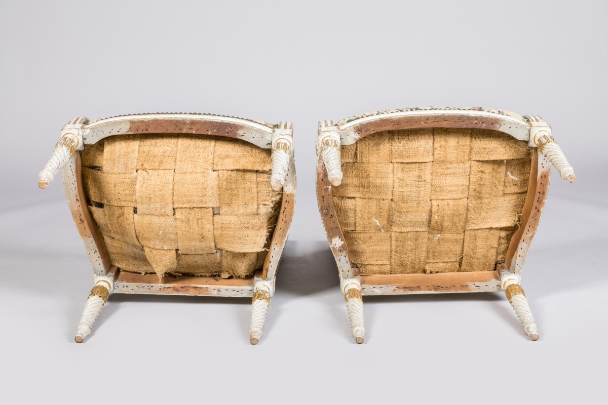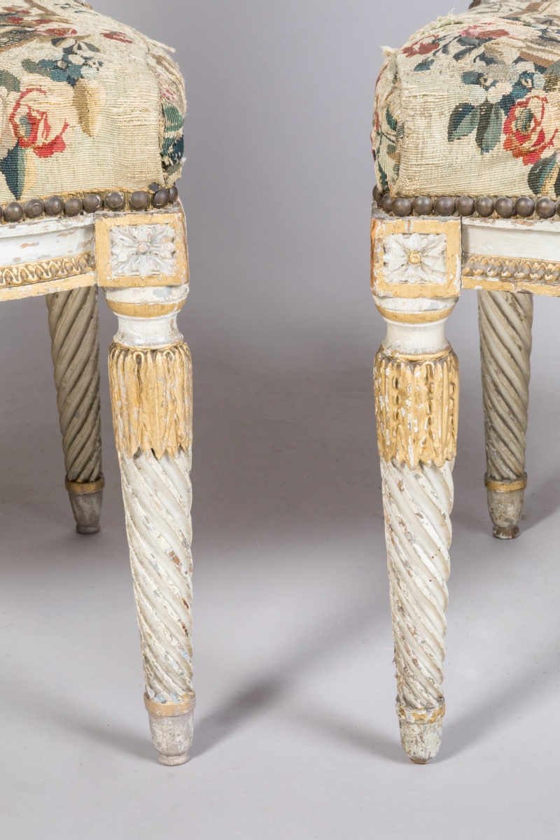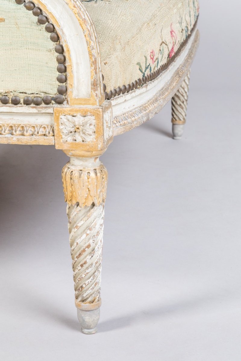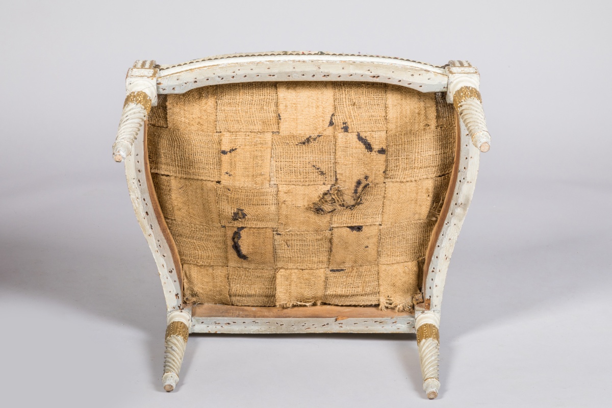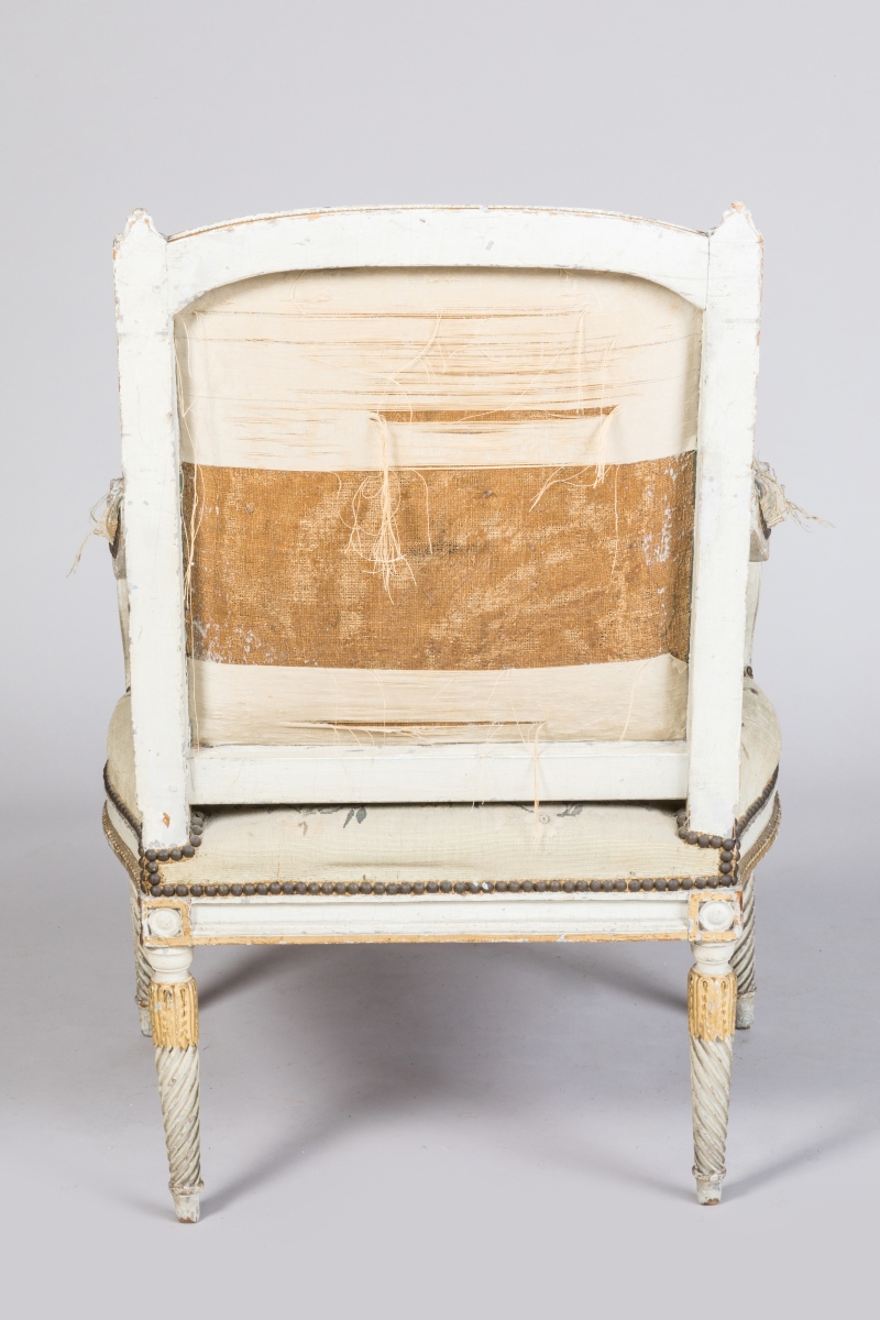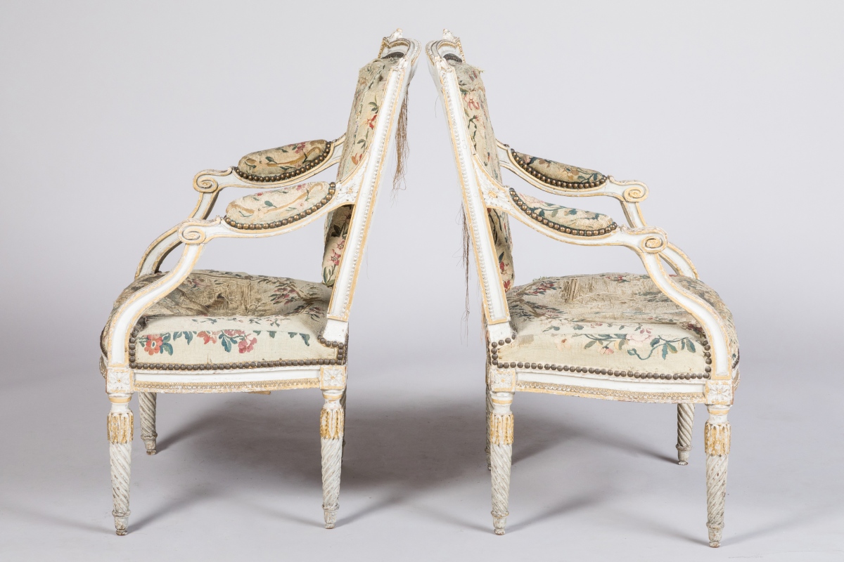 en bois sculpté, laqué gris "Marie-Antoinette". Il se compose d'une MARQUISE, d'un FAUTEUIL à la Reine, de deux FAUTEUILS à dossier plat et de deux CHAISES. Les dossiers plats dit "à la Reine" présentent un rang de rais-de-cœur et un rang de perles soulignant les réserves en élégi, des côtés. Les têtes des montants sont surmontées de grappes d'acanthe, en pyramide. Les accotoirs à manchettes garnies reposent sur des consoles inversées, décreusées de cannelures aux rubans torses, sur un axe, terminées par des asperges. Les dés de raccordement sont centrés de rosettes. Les ceintures trapézoïdales présentent également un rang de rais-de-cœur. Les sièges reposent sur des pieds fuselés à cannelures hélicoïdales, à décor de feuilles de laurier, en partie haute.