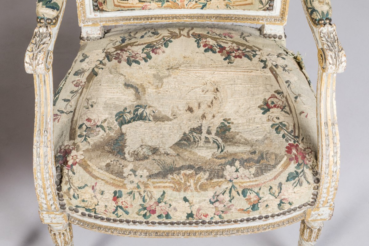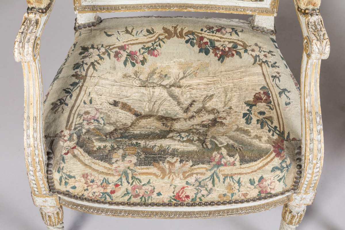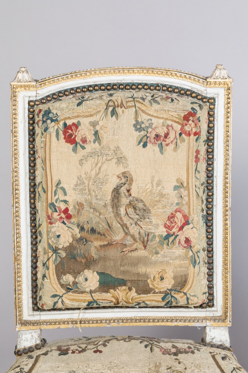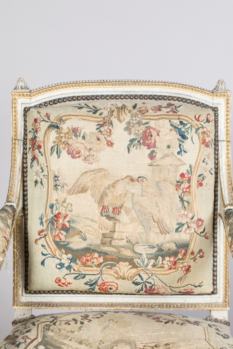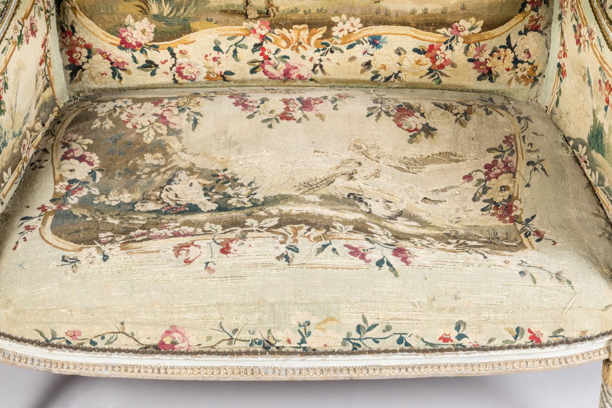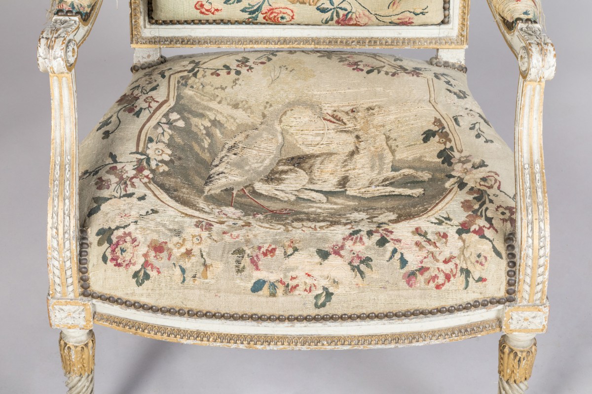 A fine Louis XVI furniture made of a MARQUISE, a flat back ARMCHAIR, two ARMCHAIRS and two CHAIRS. Covered in Aubusson tapestry depicting La Fontaine's Fables. Attributed to Claude SENÉ or BOULARD.