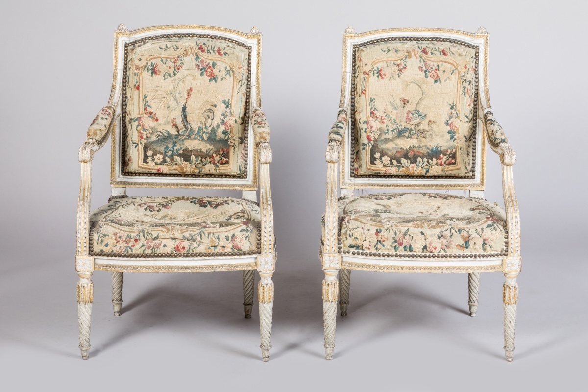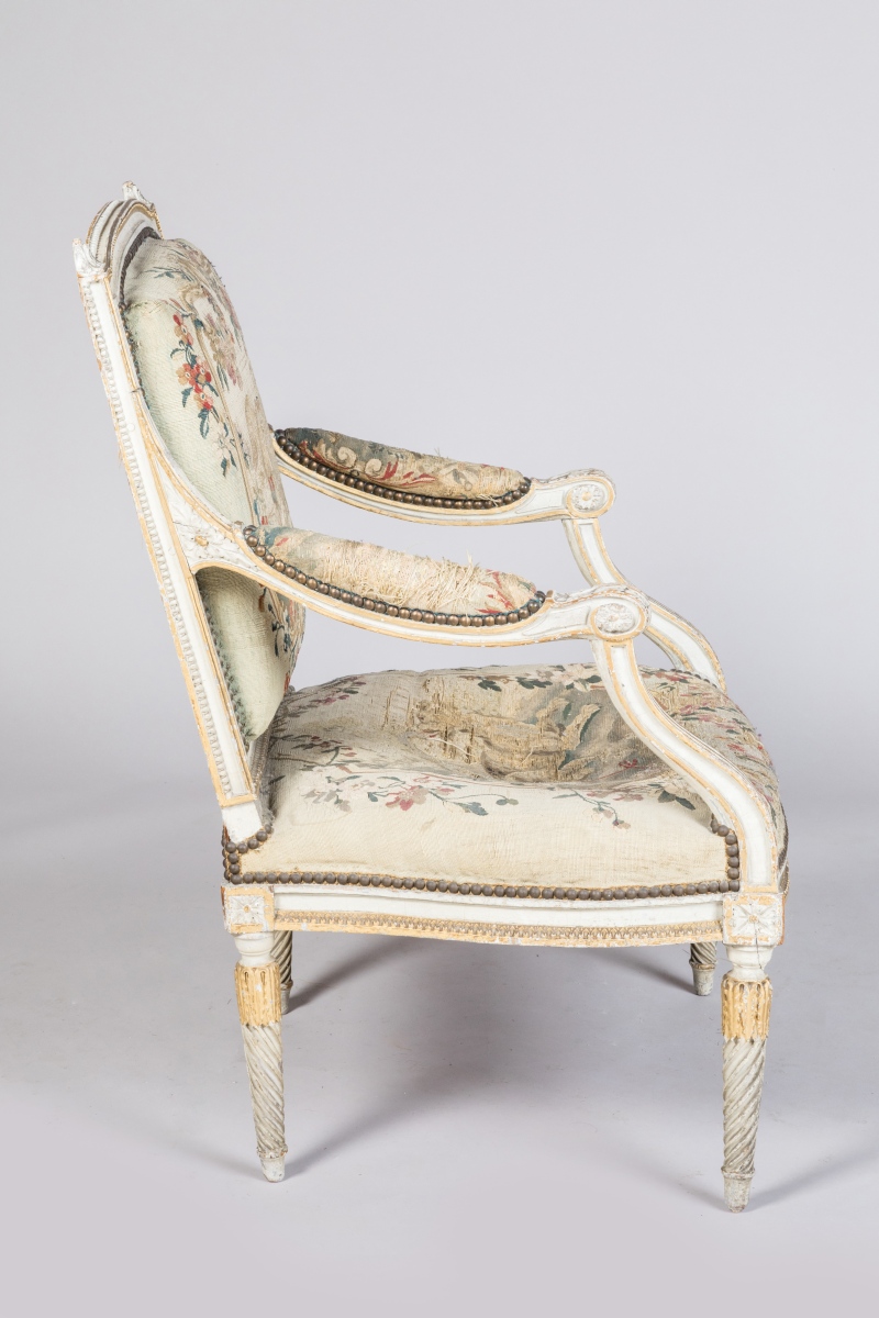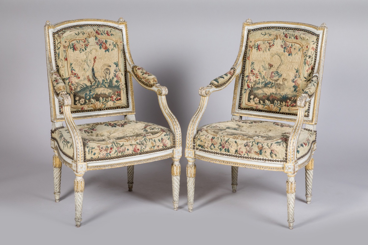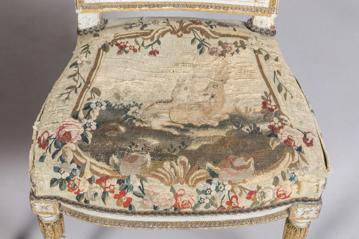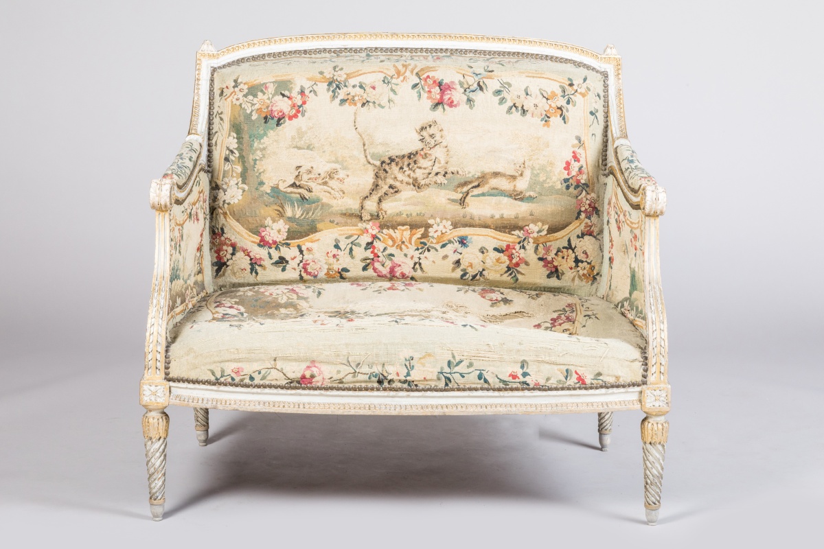 A fine Louis XVI furniture made of a MARQUISE, a flat back ARMCHAIR, two ARMCHAIRS and two CHAIRS. Covered in Aubusson tapestry depicting La Fontaine's Fables. Attributed to Claude SENÉ or BOULARD.