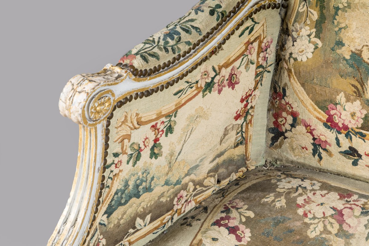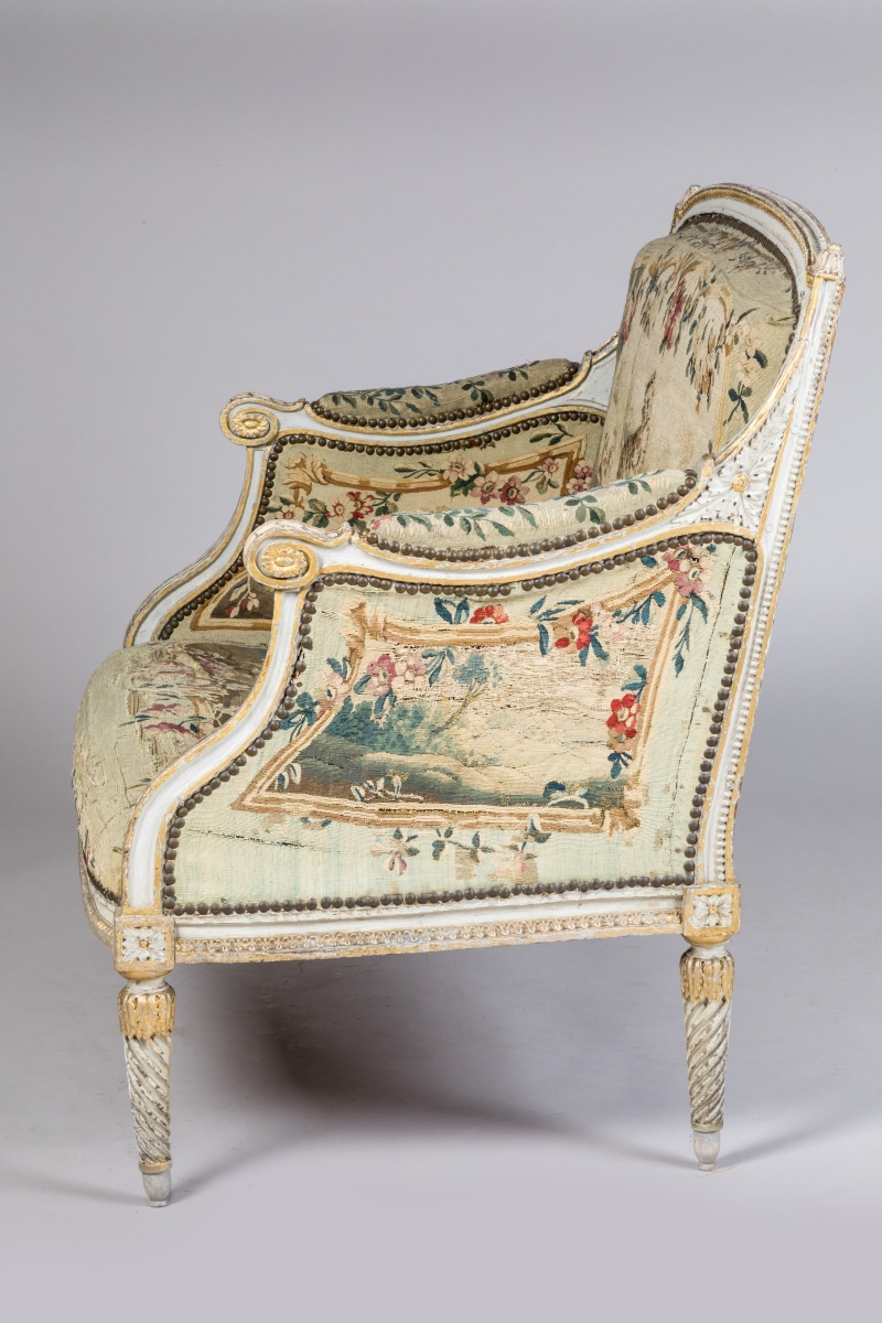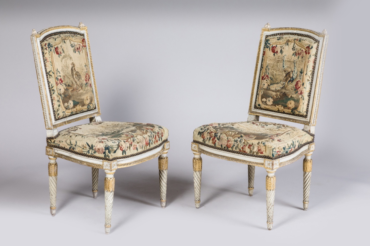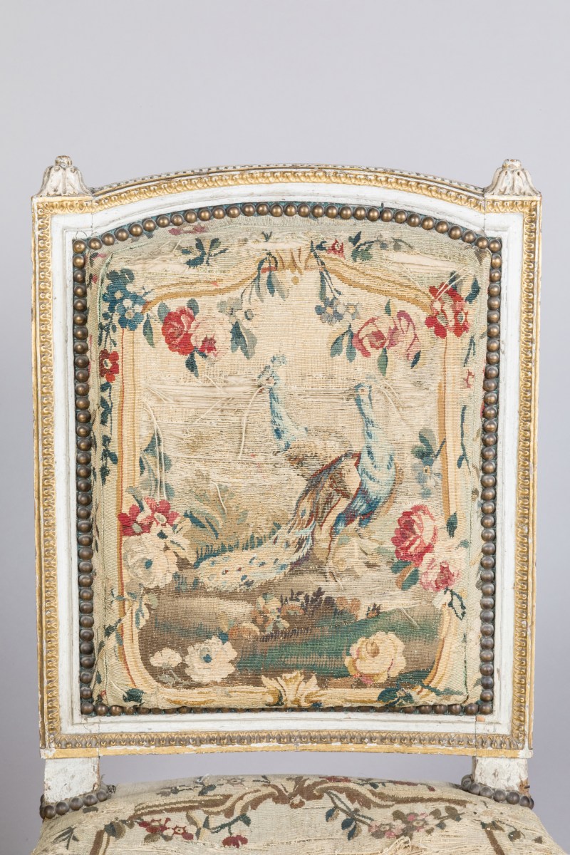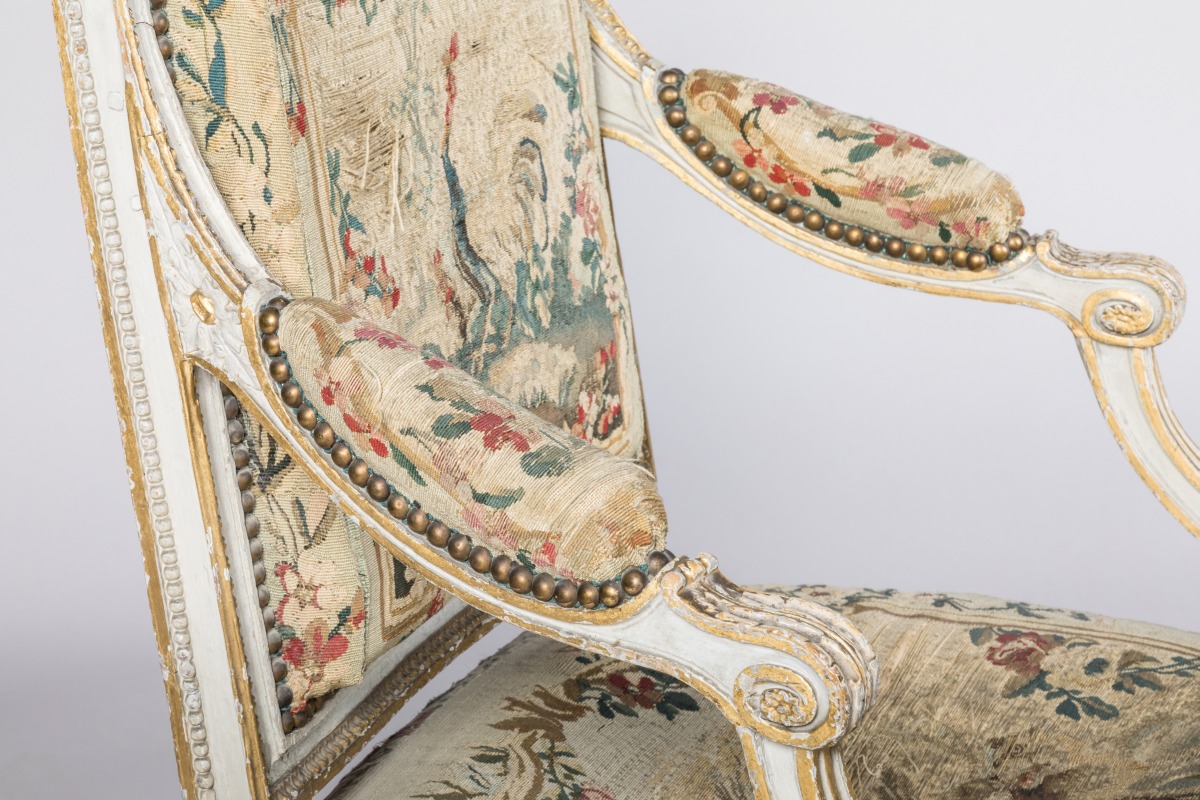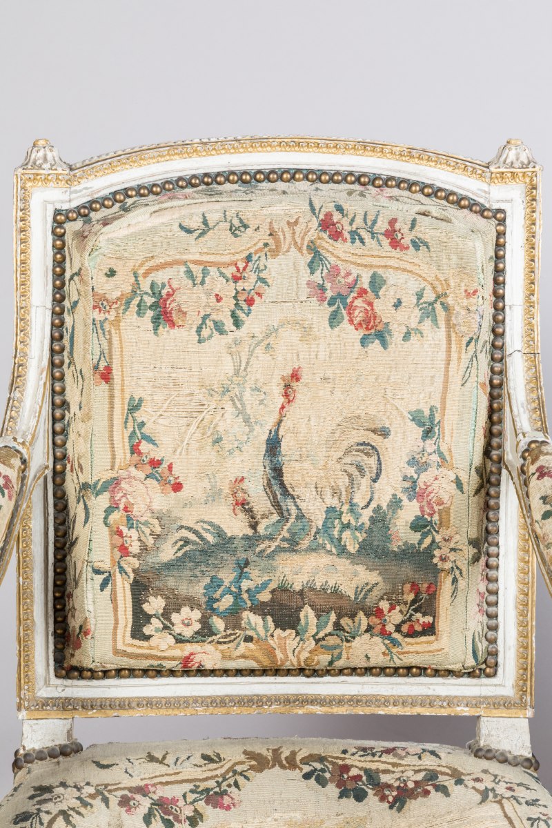 A fine Louis XVI furniture made of a MARQUISE, a flat back ARMCHAIR, two ARMCHAIRS and two CHAIRS. Covered in Aubusson tapestry depicting La Fontaine's Fables. Attributed to Claude SENÉ or BOULARD.