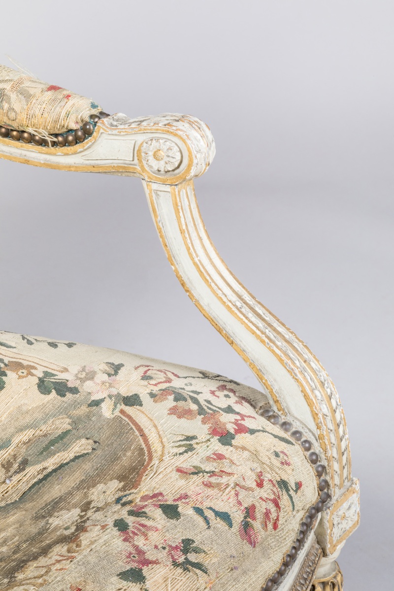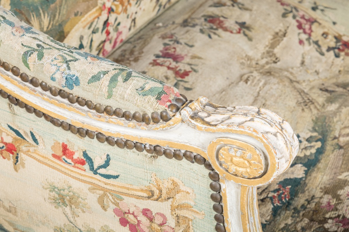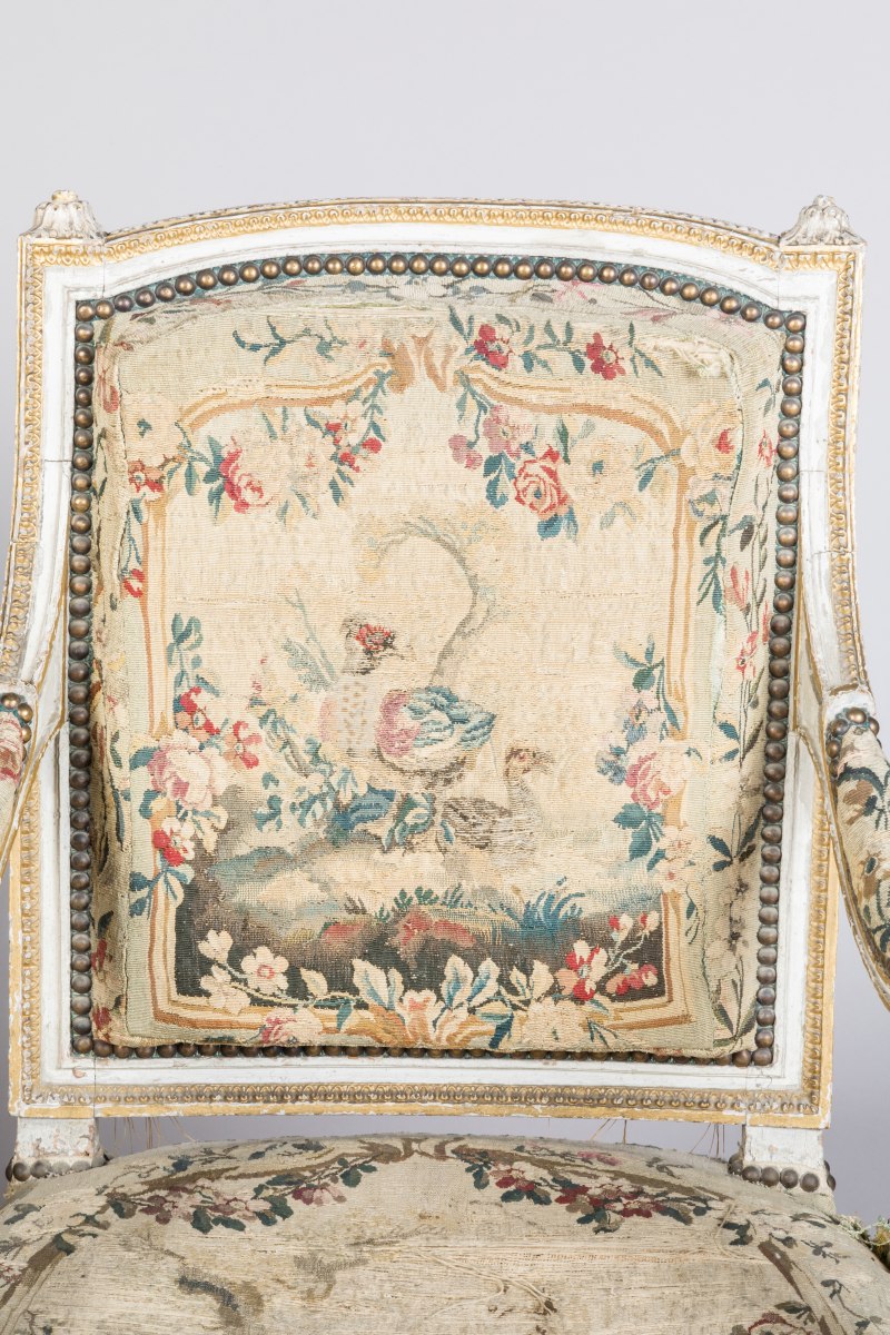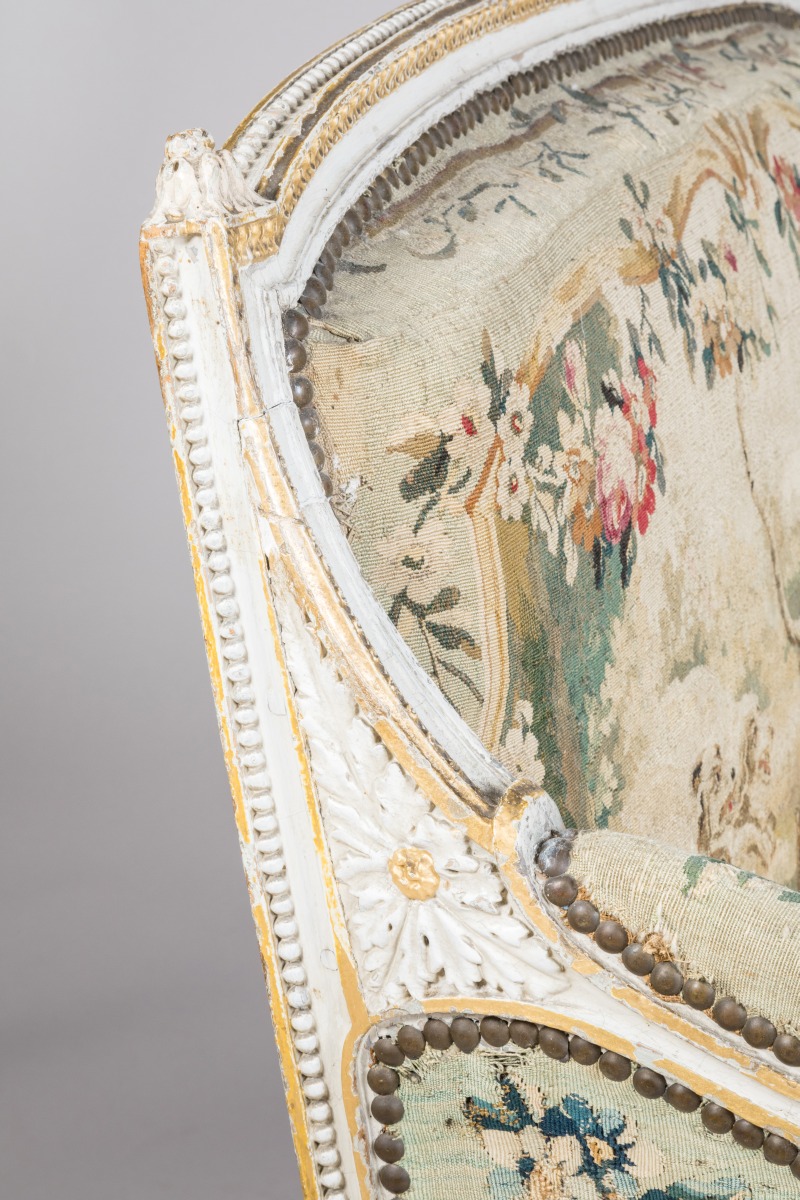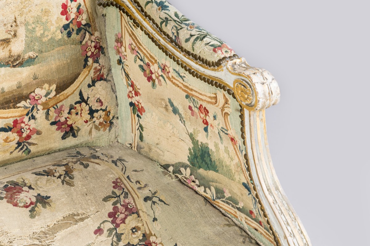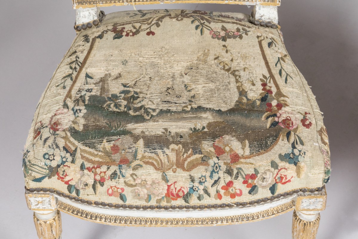 A fine Louis XVI furniture made of a MARQUISE, a flat back ARMCHAIR, two ARMCHAIRS and two CHAIRS. Covered in Aubusson tapestry depicting La Fontaine's Fables. Attributed to Claude SENÉ or BOULARD.