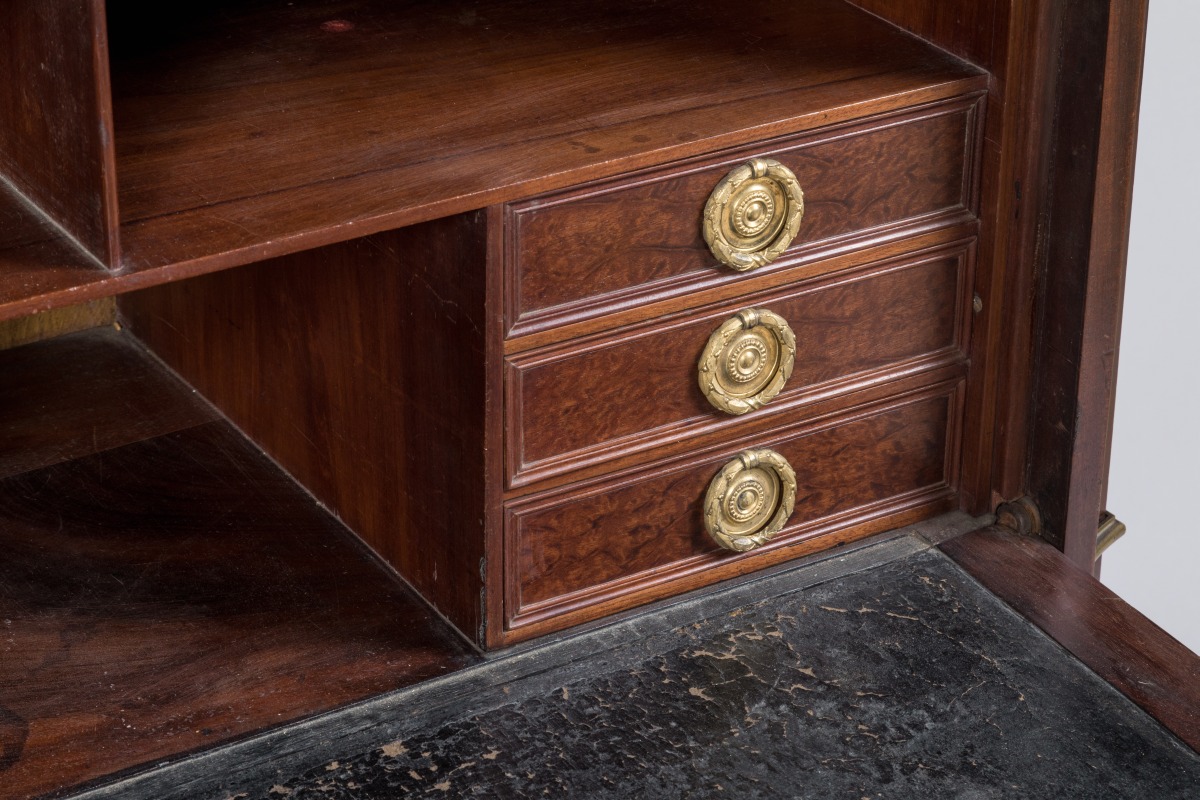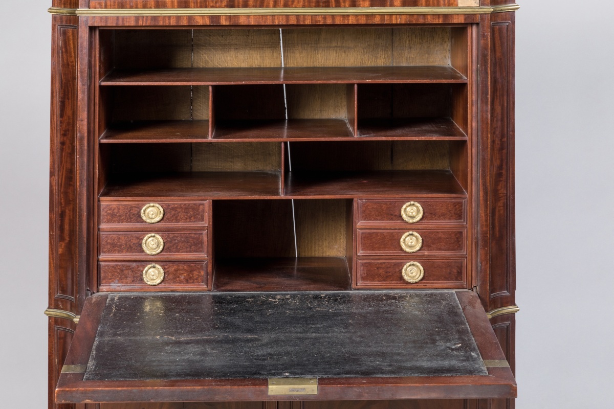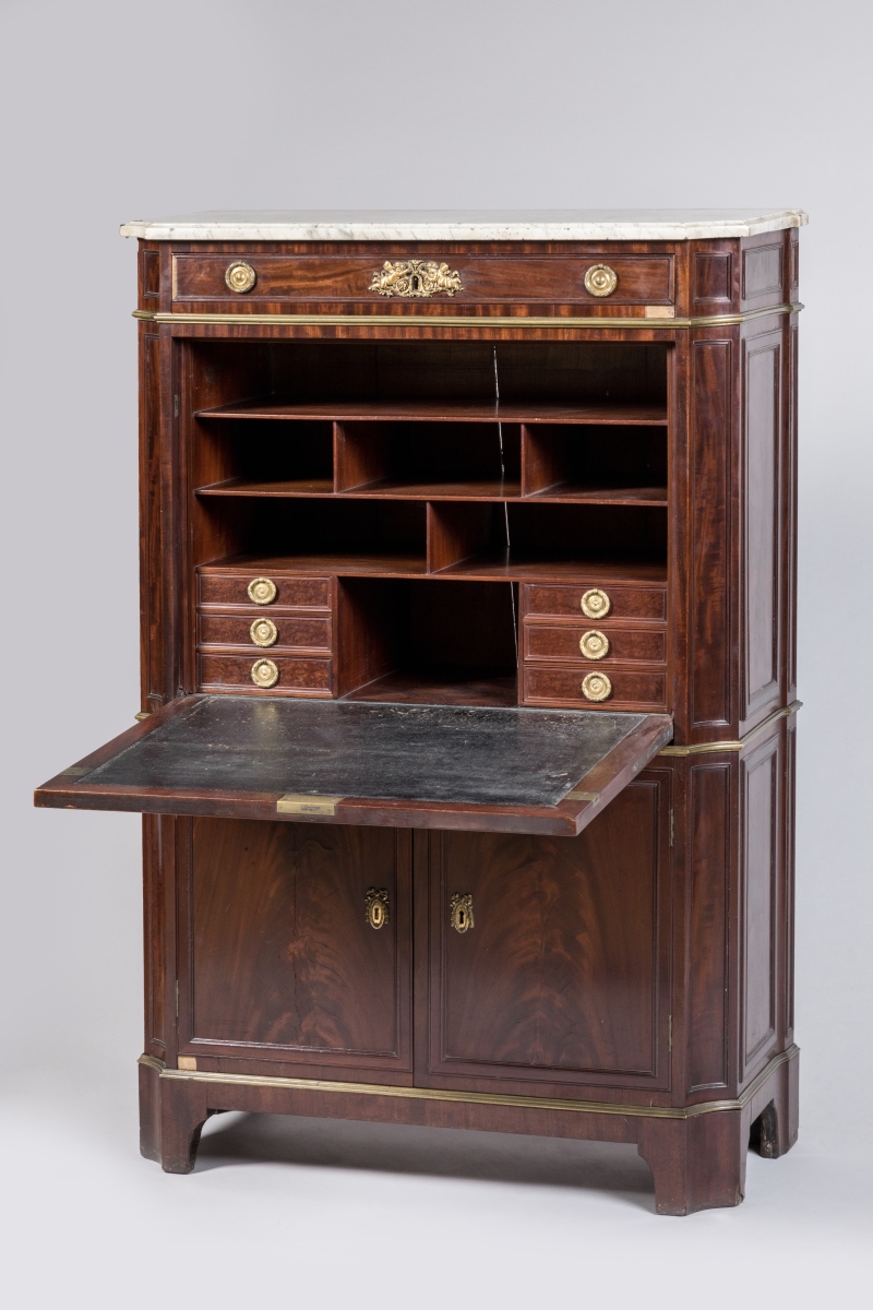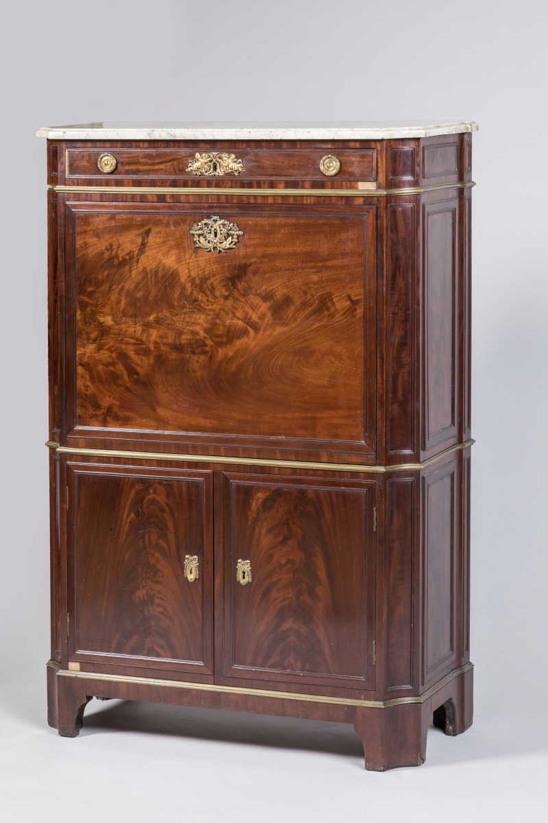 A Louis XVI mahogany SECRETAIRE with gilt bronze ornaments. White marble top. Erased stamp. From Jean-Nicolas Buache's collection, First Geographer to the King under the reign of Louis XVI, by descent.
