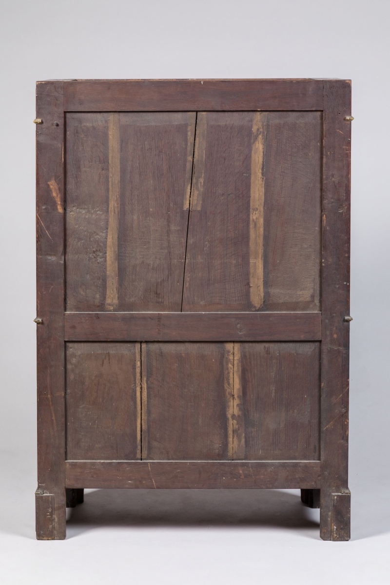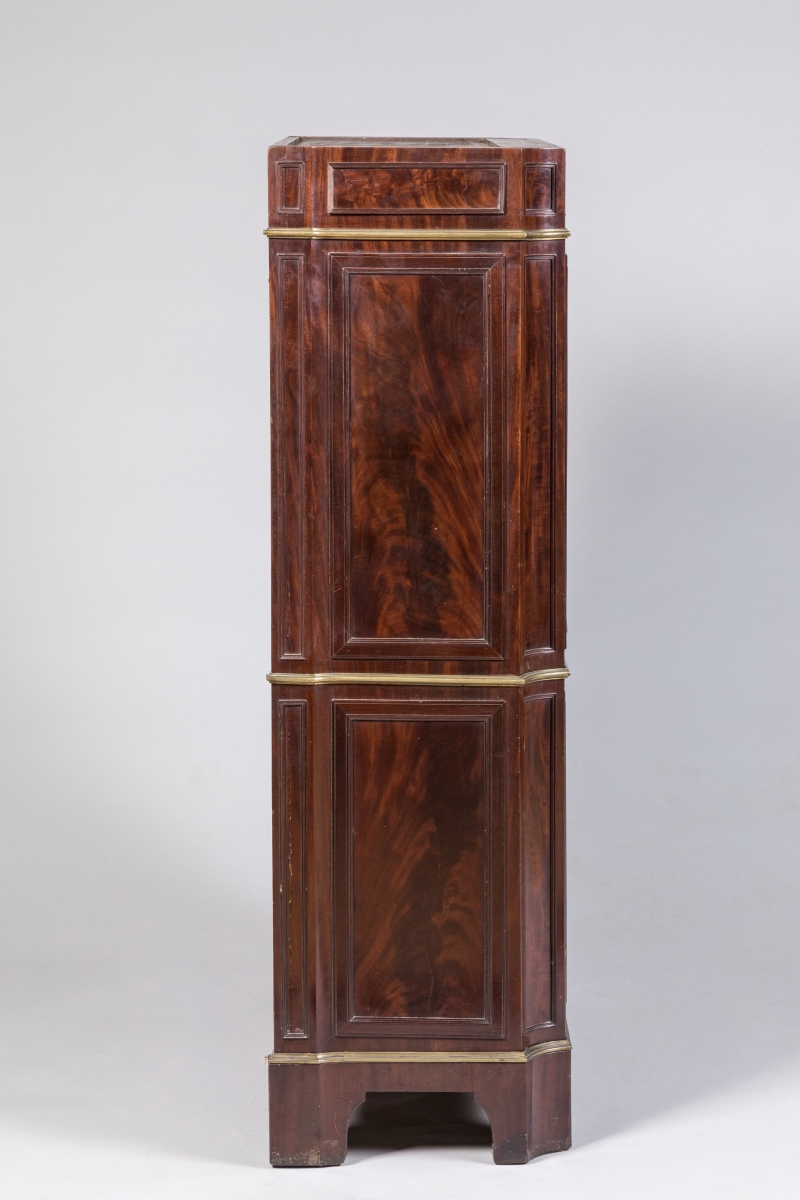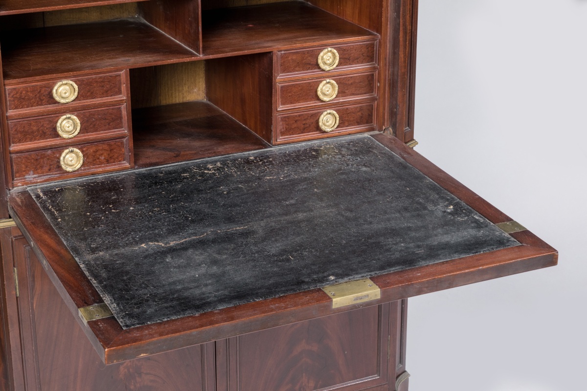 en placage d'acajou flammé et acajou. Il ouvre à un tiroir et un abattant découvrant un "castin" en acajou à six tiroirs. En partie basse, il ouvre à deux vantaux découvrant deux compartiments en chêne, dont un à une façade en abattant. Les montants arrière sont en ressaut. Il présente un décor de cadres d'acajou moulurés. Il repose sur une base en ressaut, formant les pieds.