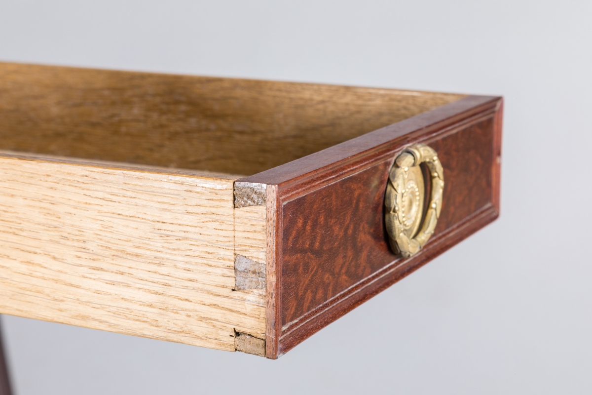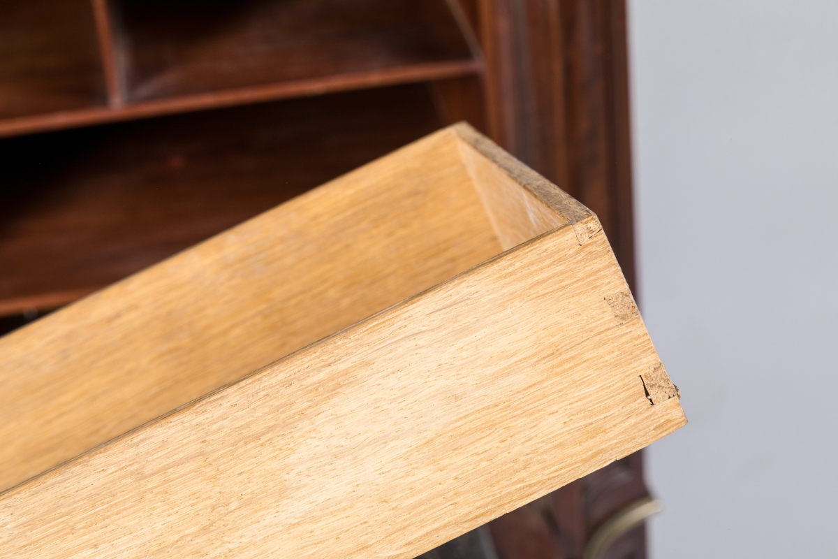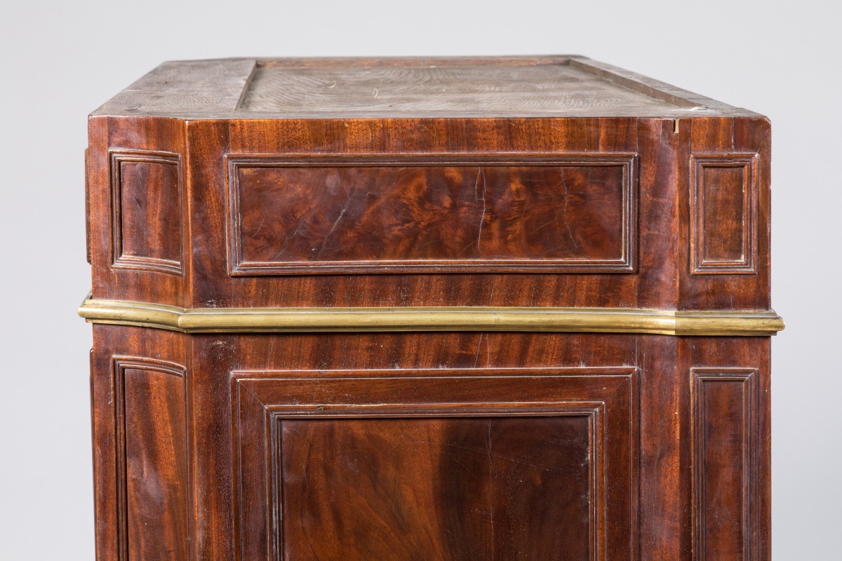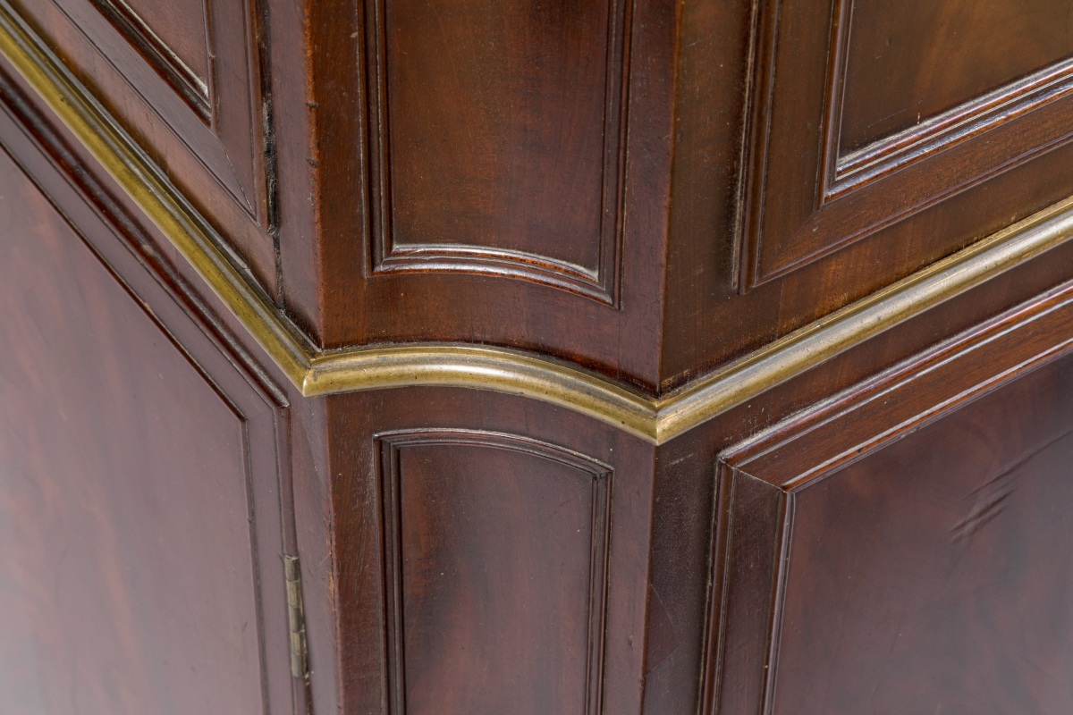 en placage d'acajou flammé et acajou. Il ouvre à un tiroir et un abattant découvrant un "castin" en acajou à six tiroirs. En partie basse, il ouvre à deux vantaux découvrant deux compartiments en chêne, dont un à une façade en abattant. Les montants arrière sont en ressaut. Il présente un décor de cadres d'acajou moulurés. Il repose sur une base en ressaut, formant les pieds.
