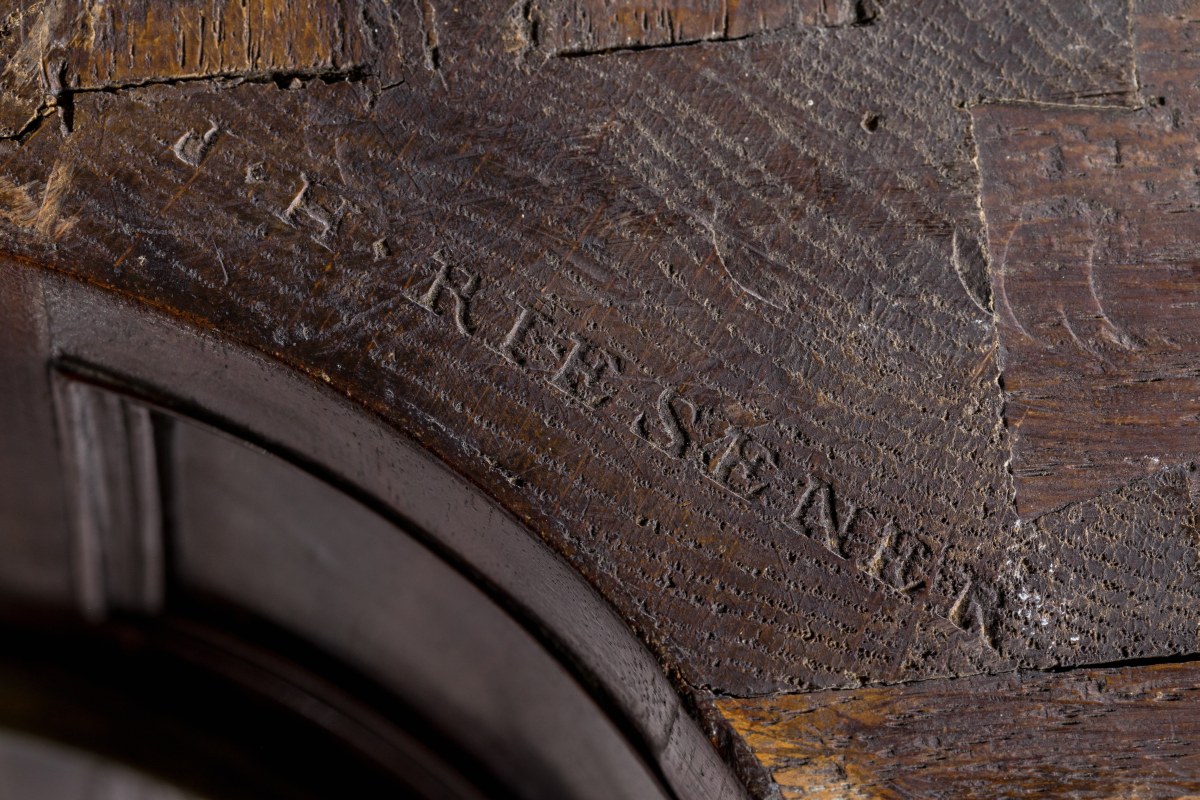 La présence de l'estampille apocryphe de Riesener s'explique sur ce meuble qui est incontestablement un meuble de qualité. Ce secrétaire est rigoureusement calqué sur les dessins des secrétaires de Riesener: la proportion, le choix varié des acajous et les deux entrées de serrure en bronze, fixées sur le tiroir et sur l'abattant. Riesener a eu un tel rayonnement qu'il est normal qu'il soit ou copié ou suivi, dès la fin du XVIIIe siècle. Il est fort possible aussi que " Richter " ait eu une commande d'un secrétaire à la " façon de Riesener".