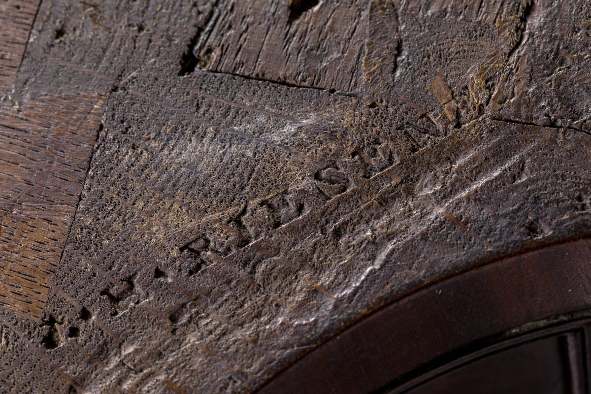 Ornementation de bronzes ciselés et dorés: trois astragales soignent l'abattant des vantaux et du tiroir, anneaux aux lauriers et à pastilles, entrée de serrure ajourées à décor de putti en vis-à-vis et entrée de serrure aux cornes d'abondance, sur l'abattant.