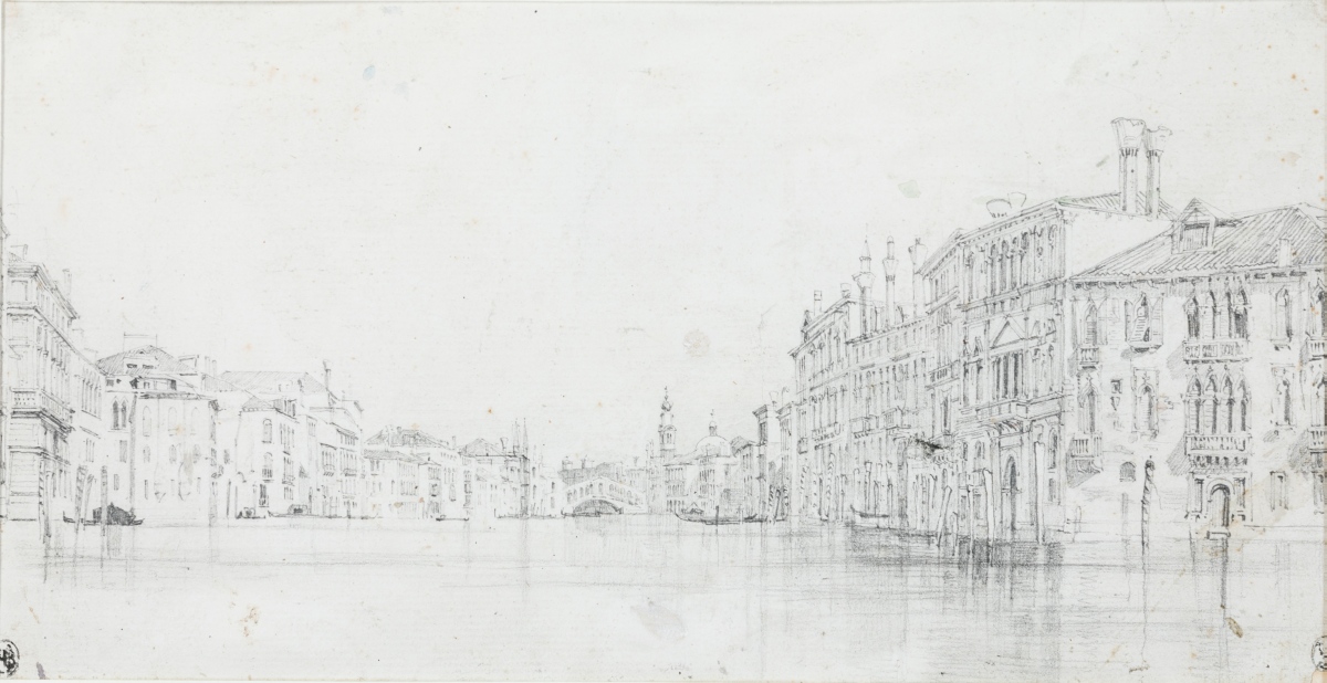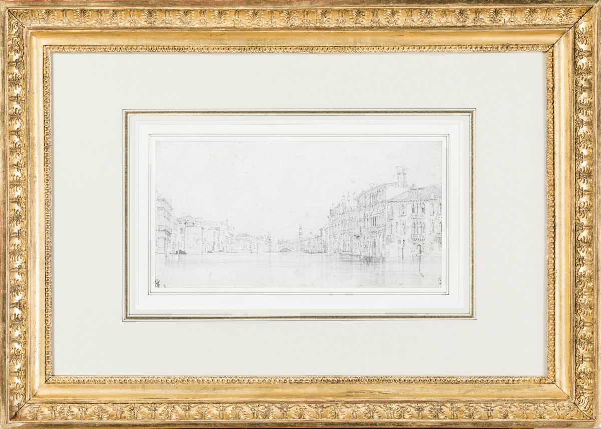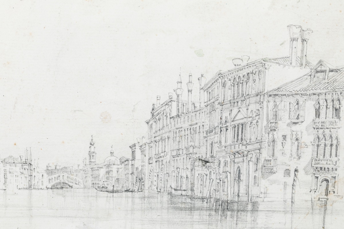 19th century BRITISH School. View of the Grand Canal in Venice with the Rialto Bridge in the background. Black pencil. Ex Alfred II Beurdeley collection, his stamp lower right and lower left.