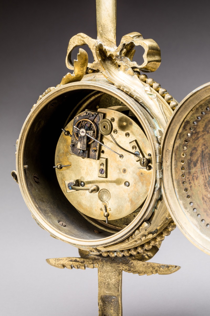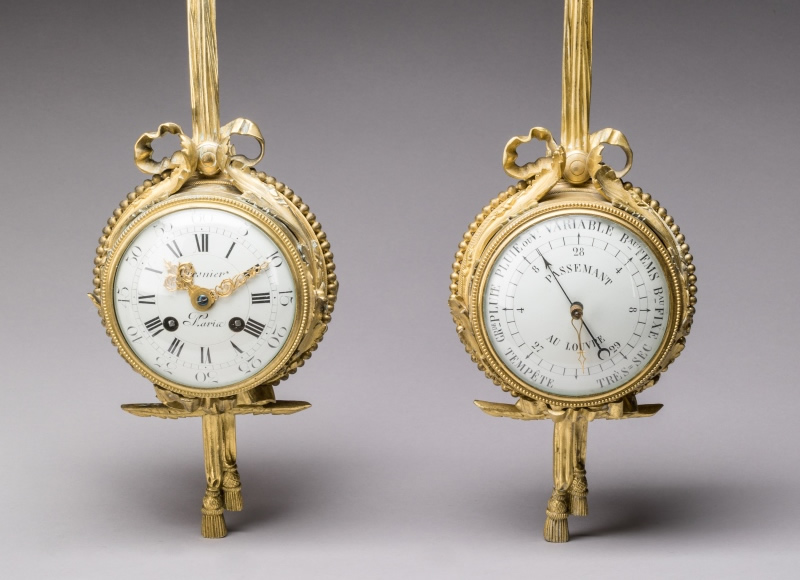 en bronze doré, de forme circulaire, suspendus par un ruban noué et terminés par des franges, dans un entourage de feuilles d'acanthe et rang de perle. Les cadrans émaillés, avec pour le baromètre signé de "Passemant au Louvre" des chiffres arabes et pour l'horloge signée de "Crosnier à Paris" des chiffres romains pour les heures, chaque période de cinq minutes en chiffres arabes et graduée pour les minutes.