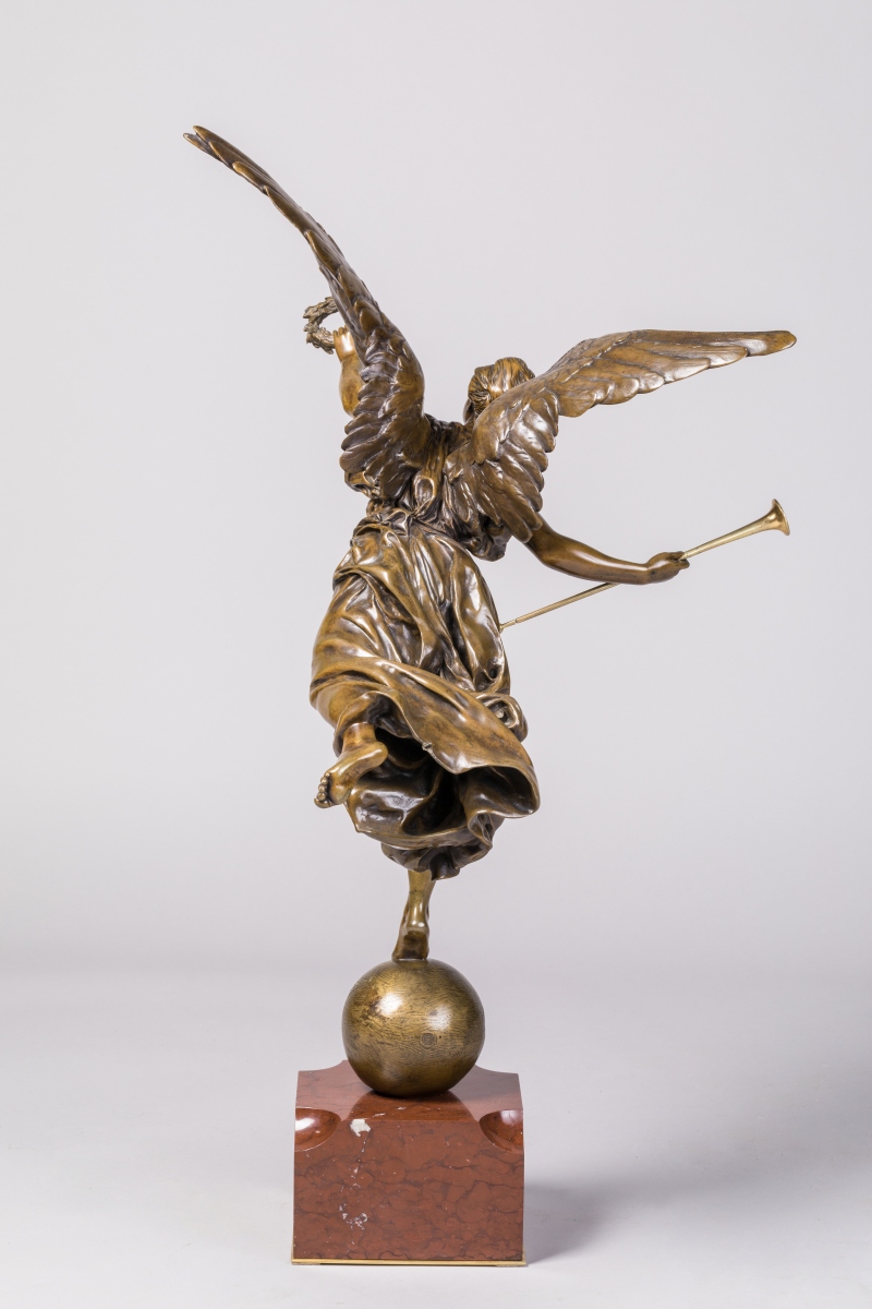 Louis-Ernest BARRIAS. Allegory of Fame. Bronze with a red griotte marble pedestal. Signed 'E. Barrias', founder's stamp and mark 'SUSSE Frères Éditeurs Paris'.