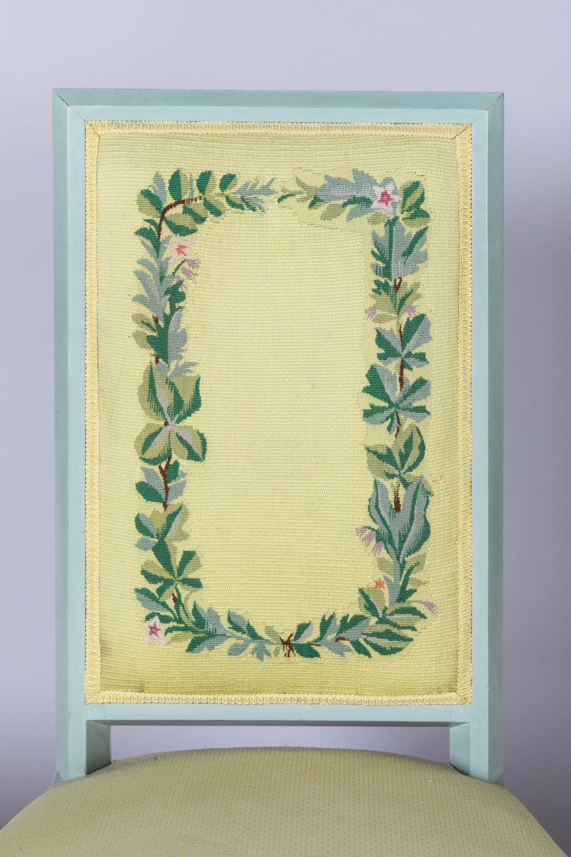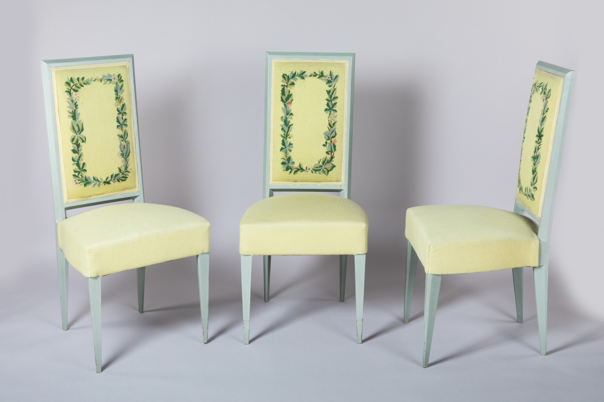 en bois laqué vert d'eau. Garniture des dossiers en tapisserie d'Aubusson à fond jaune citron tissée par Hamot.