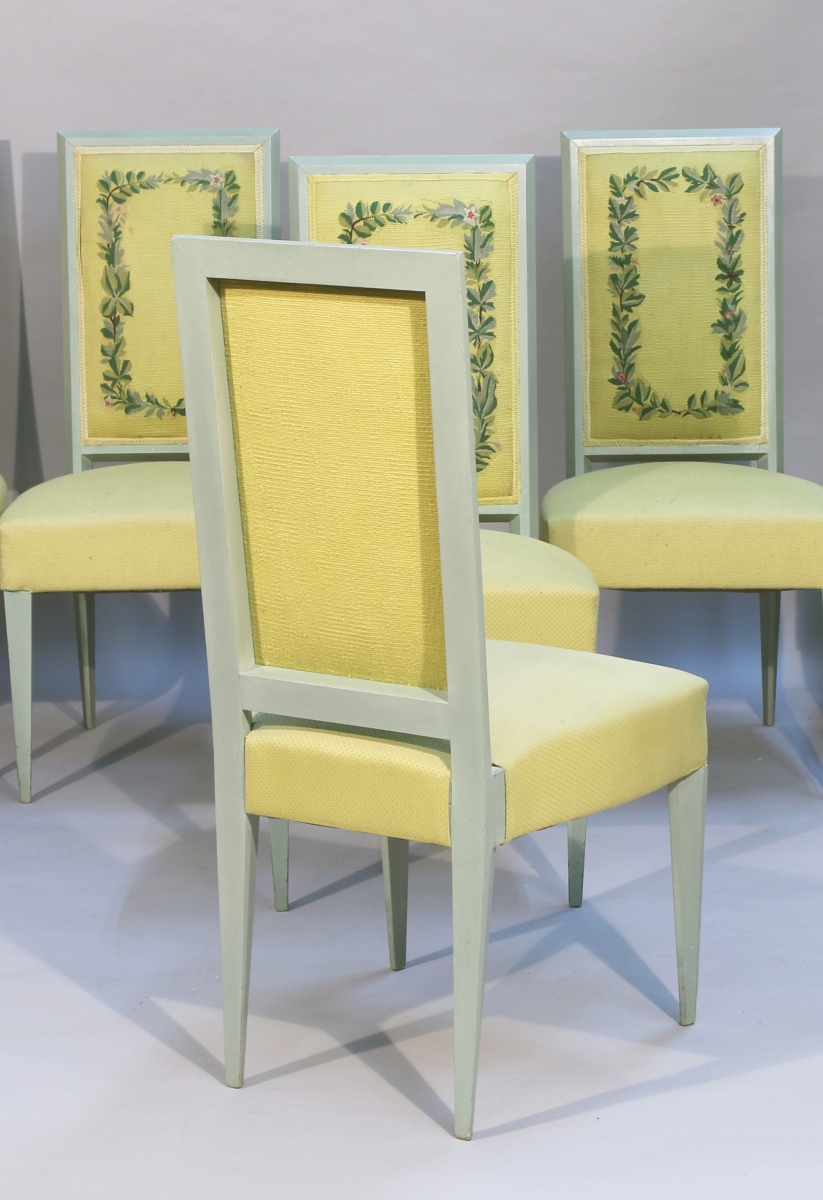 Georges GOETZ. A suite of six lacquered wood CHAIRS. Back rest covered with lime yellow Aubusson tapestrie, woven by Hamot.