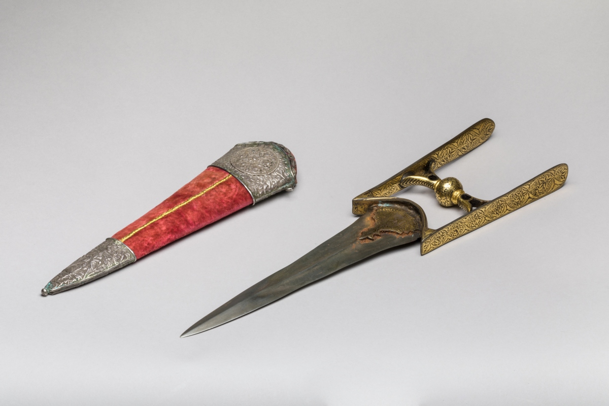 A beautiful INDIAN DAGGER, known as 'KATAR' of Shrij Maharaba Shrij Fafen. 1808. Iron damascened with gold. Rajastan. 19th century.