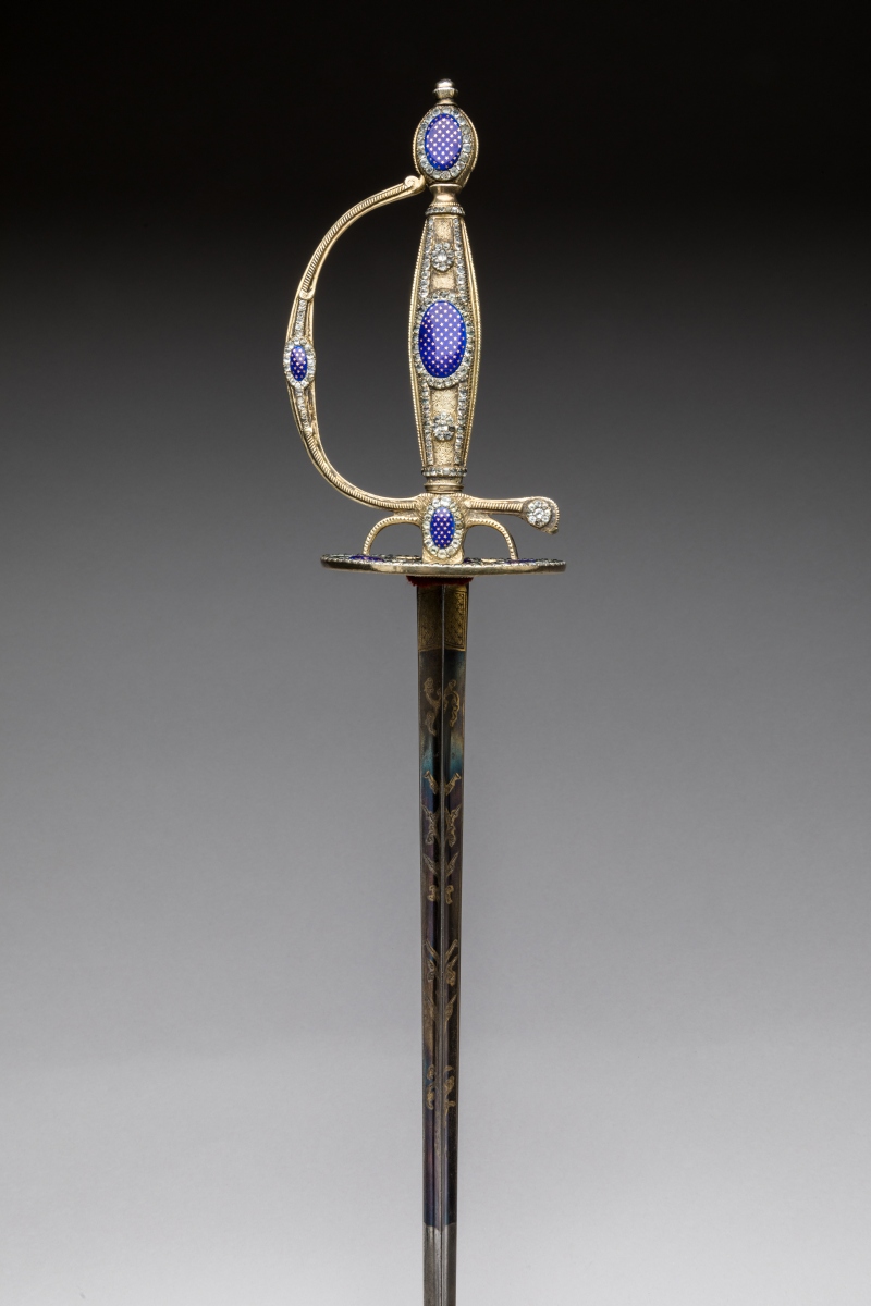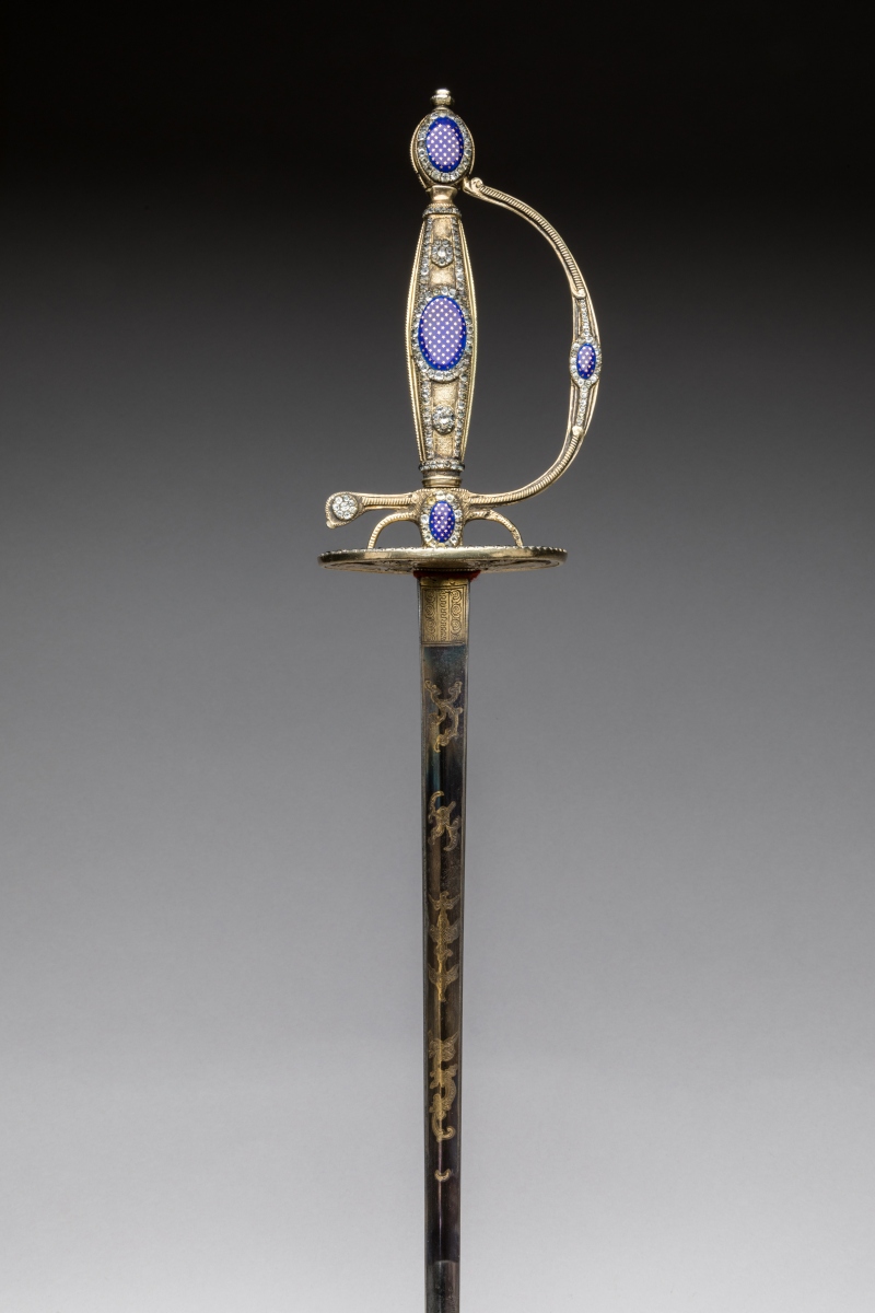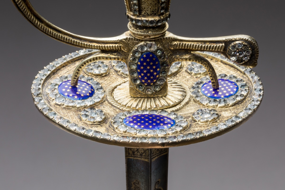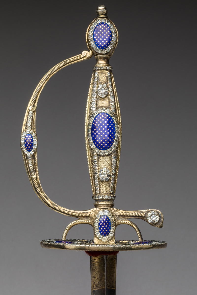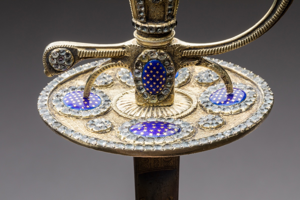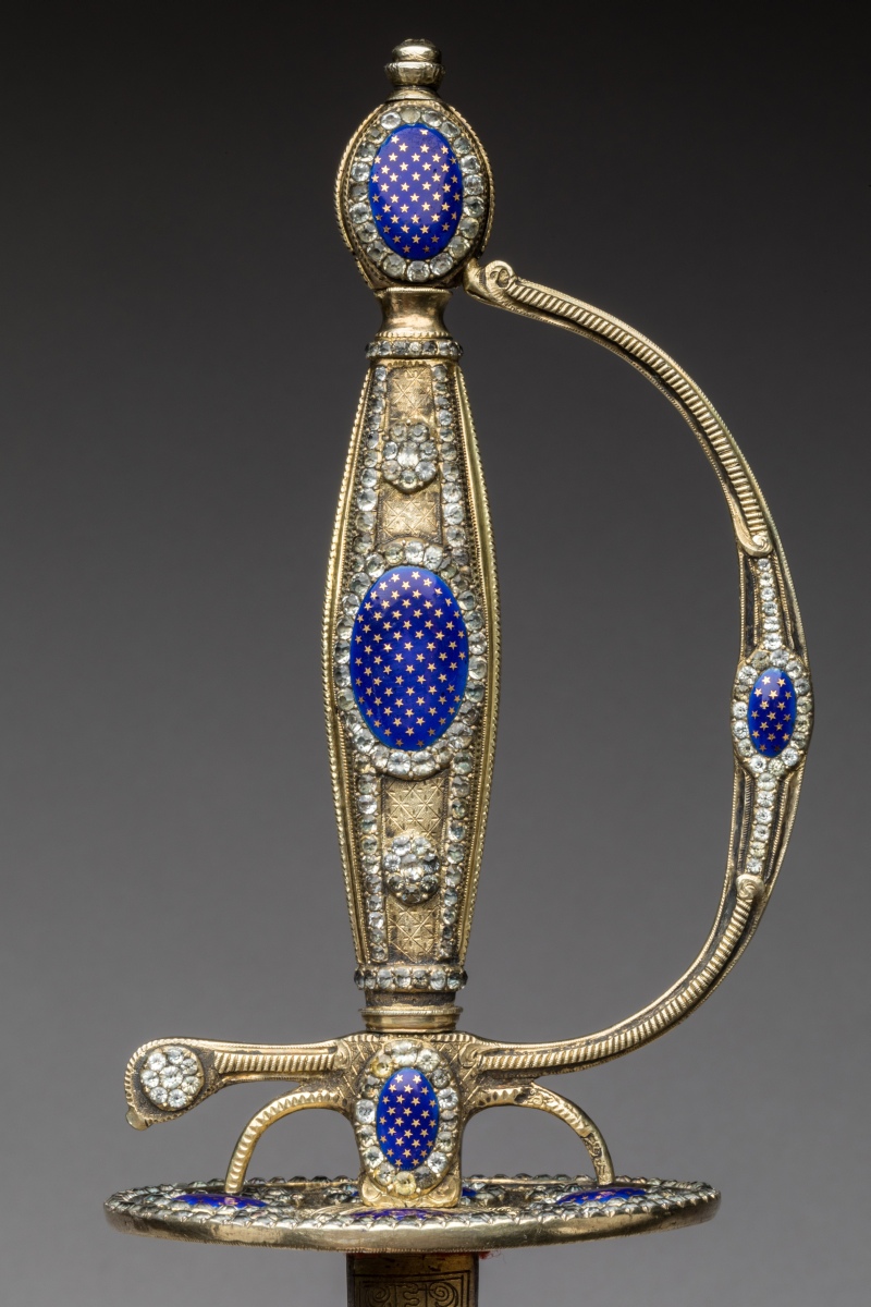Garde à une branche et pas d'âne, ornée en suite de deux médaillons enrichis de petites pierres ainsi que le noeud de corps. Quillon aplati à motif de fleurs taillées en suite. Clavier décoré de quatre médaillons, deux ronds et deux ovales, en émail bleu constellé d'étoiles, entrecoupées de quatre fleurs en pierres taillées à facettes.