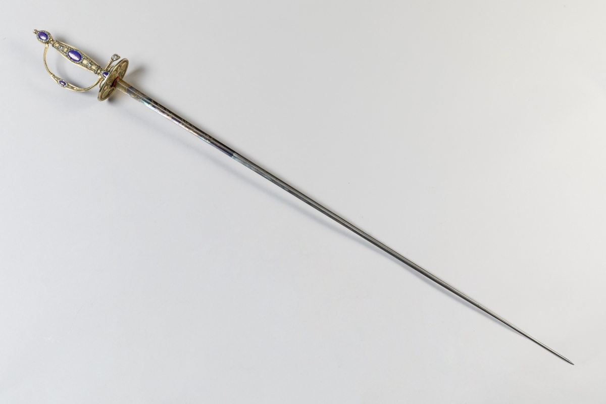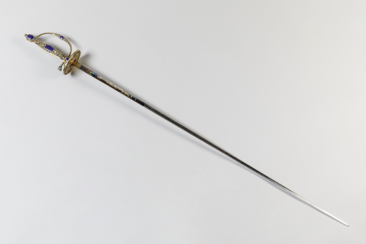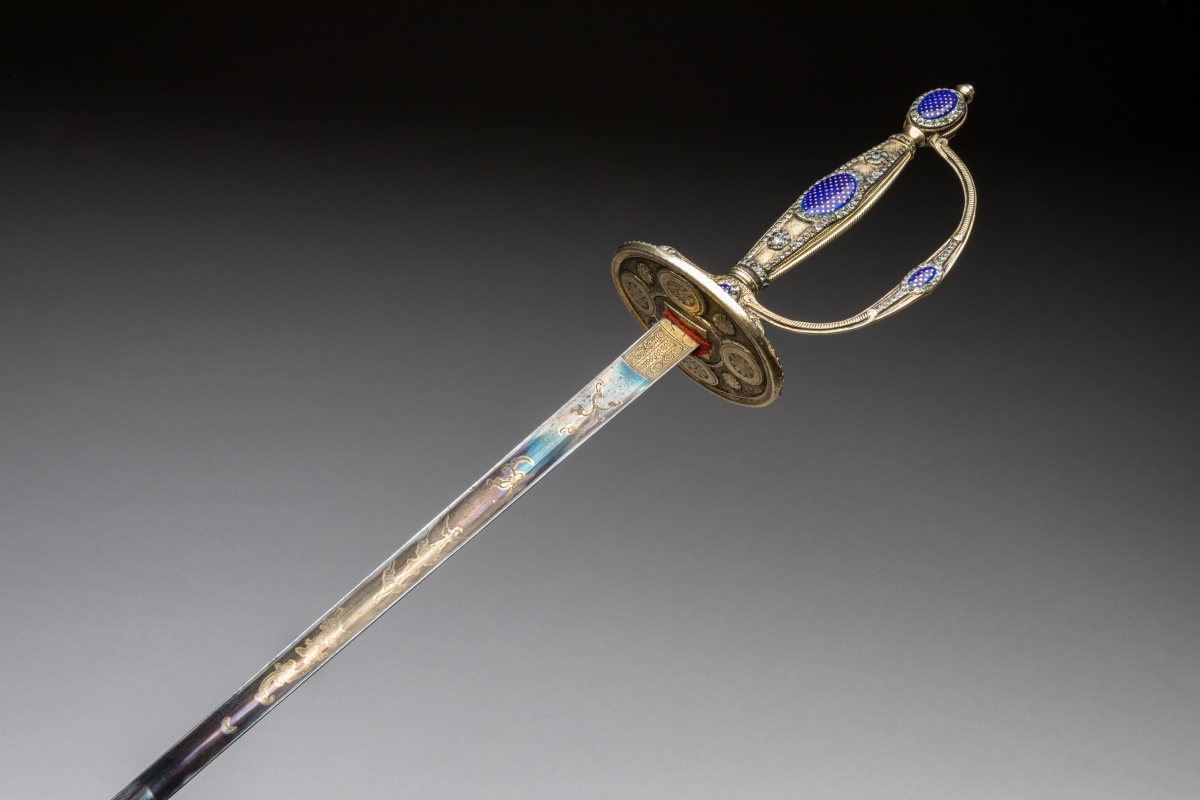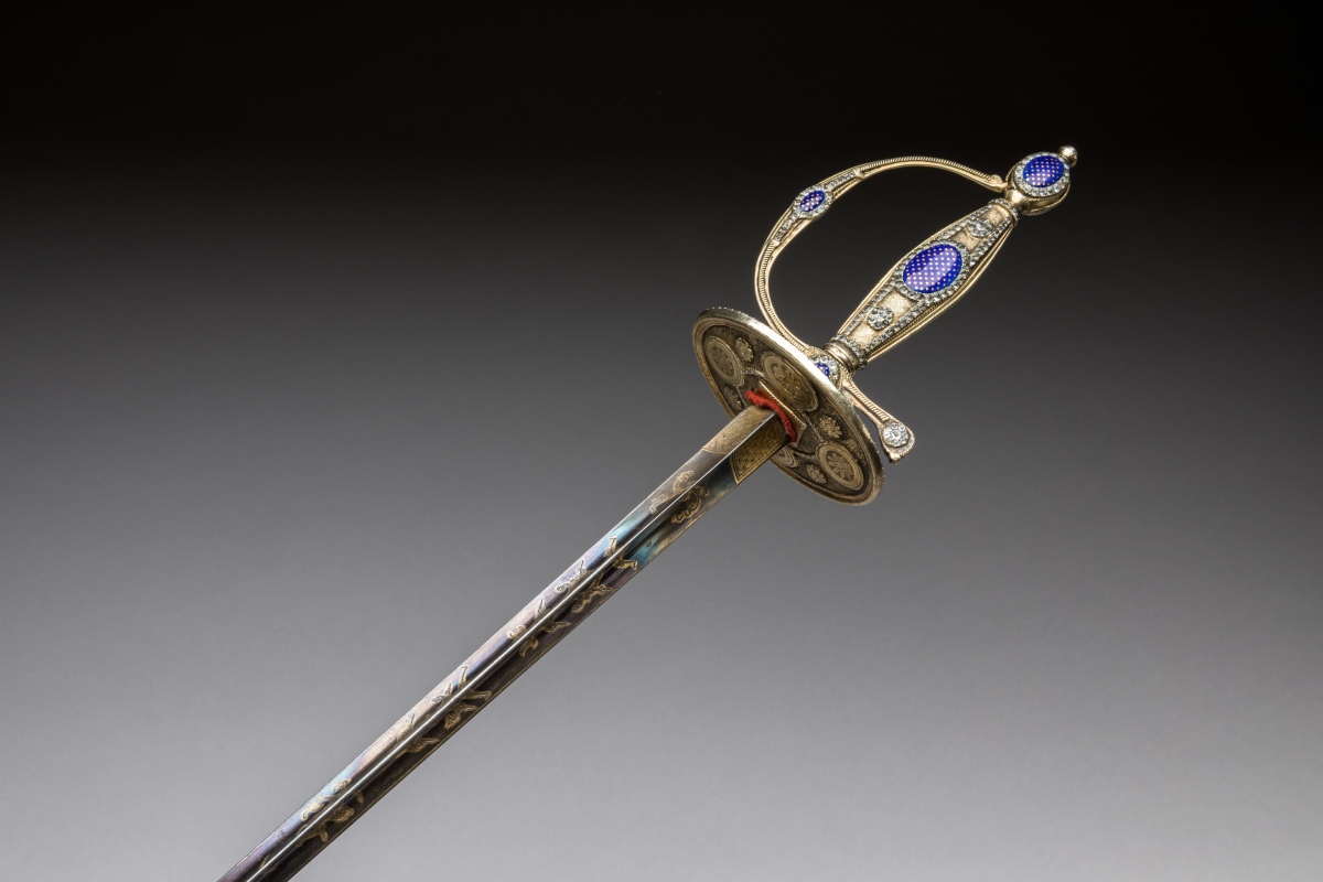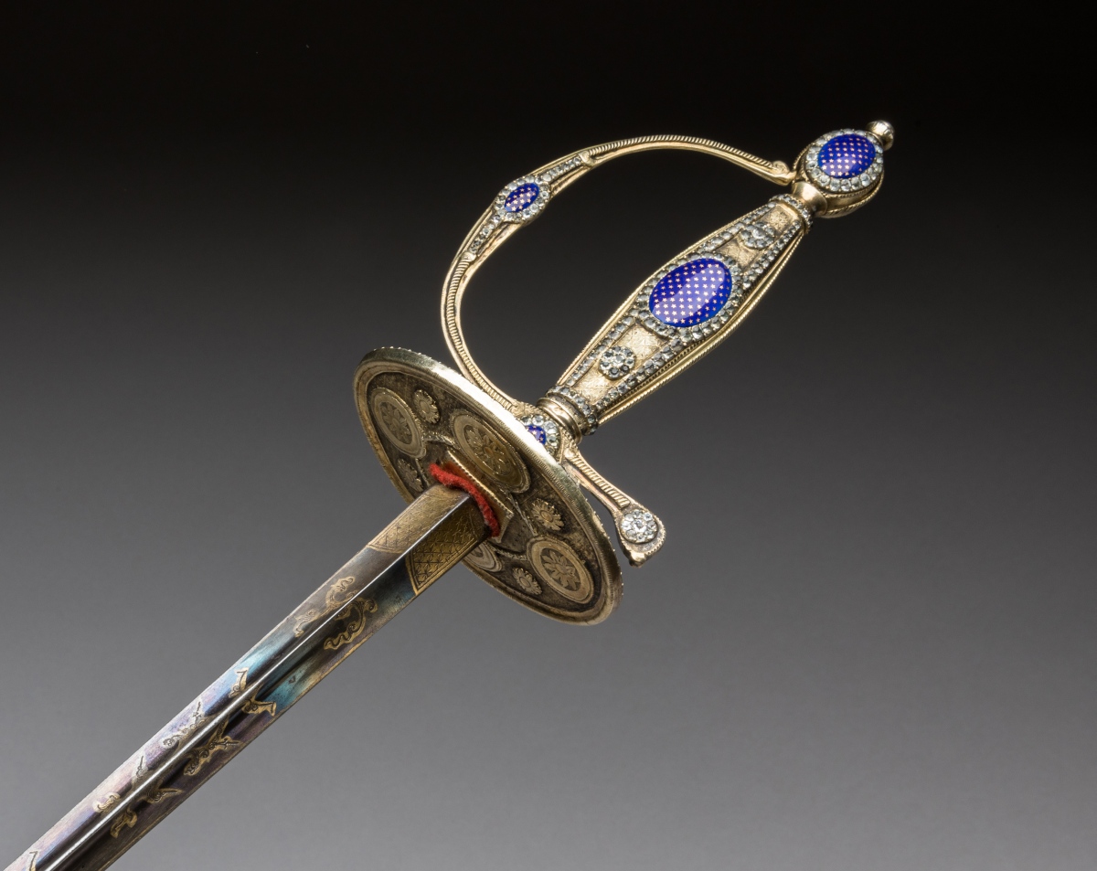 Garde à une branche et pas d'âne, ornée en suite de deux médaillons enrichis de petites pierres ainsi que le noeud de corps. Quillon aplati à motif de fleurs taillées en suite. Clavier décoré de quatre médaillons, deux ronds et deux ovales, en émail bleu constellé d'étoiles, entrecoupées de quatre fleurs en pierres taillées à facettes.
