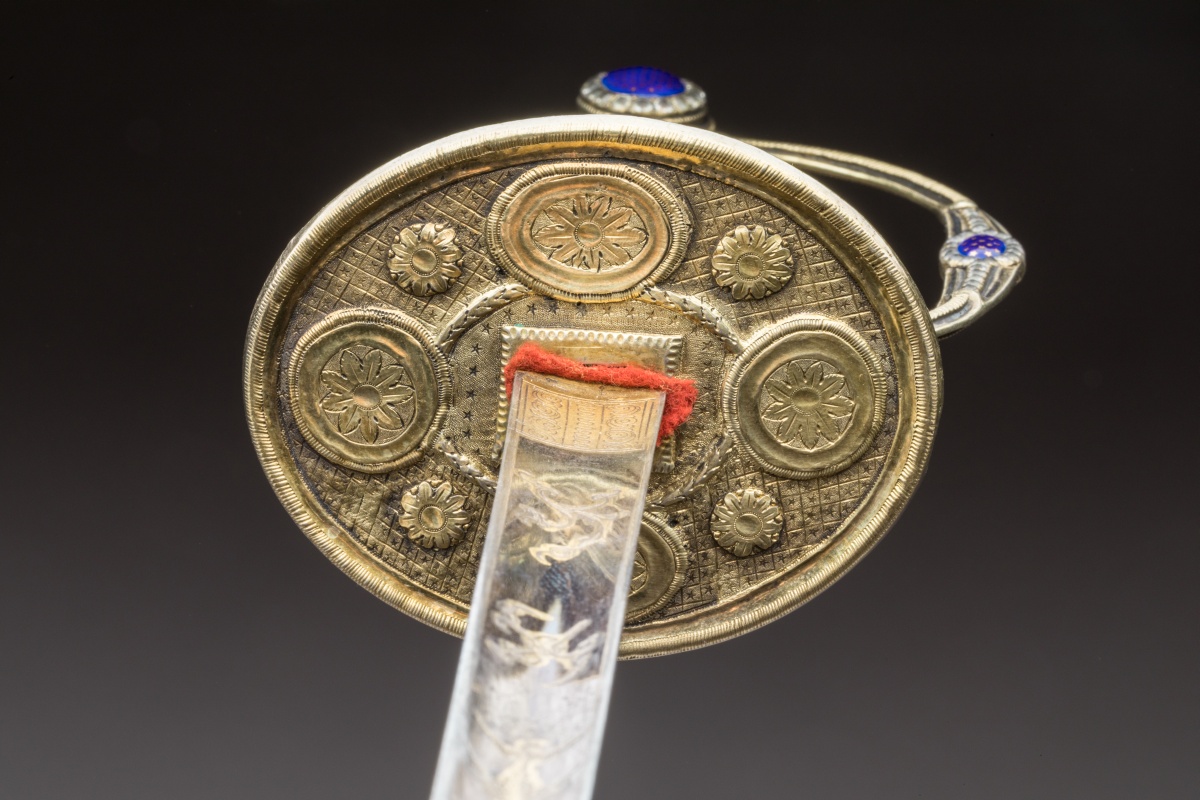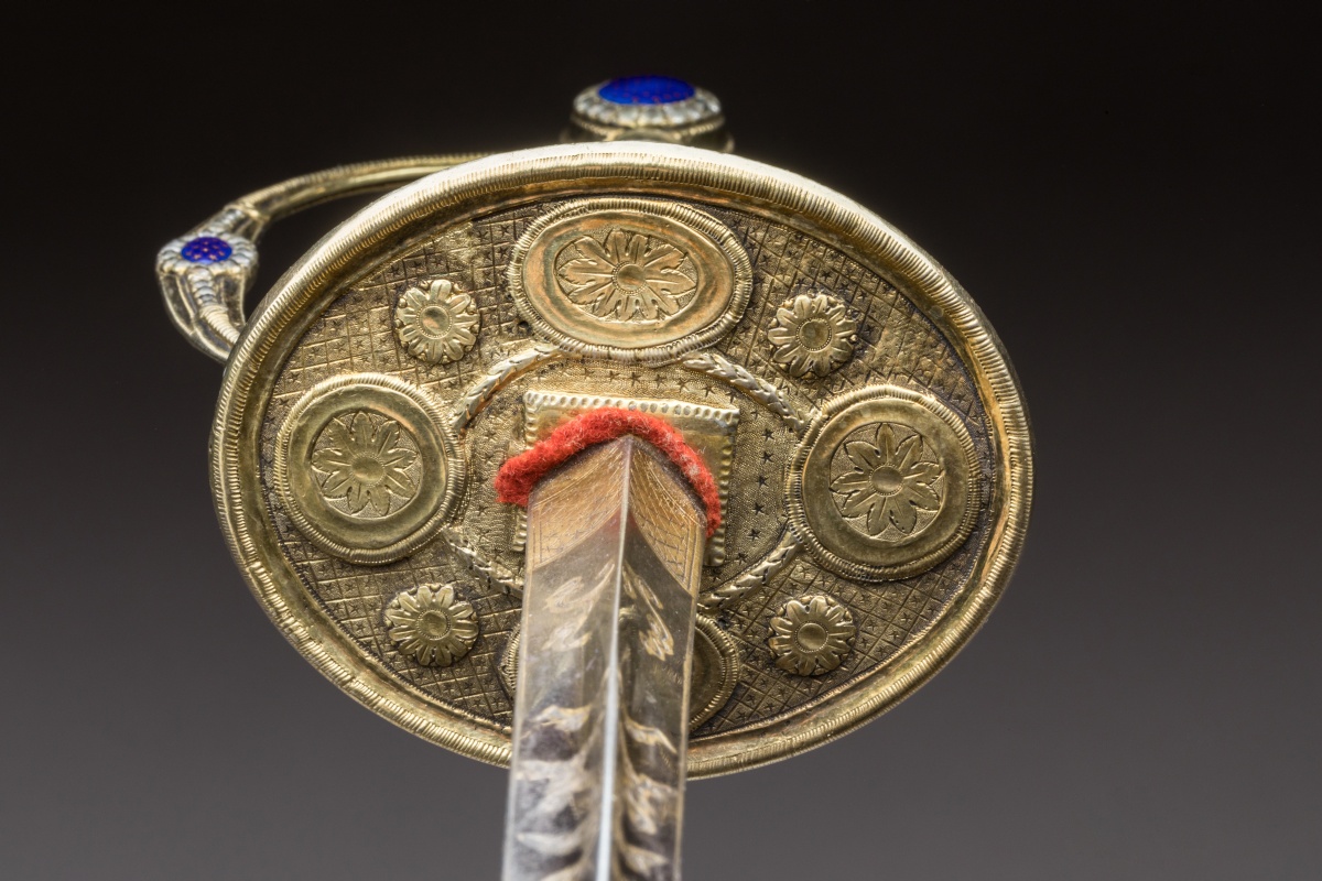 - On notera également une seconde épée, qui peut être attribuée au même orfèvre, passée en vente chez le marchand londonien d'armes anciennes Peter Finer. On retrouve là aussi le travail d'argent doré, de frises de pierres travaillés à facettes et d'émaux bleus à décor de semis d'étoiles d'or.